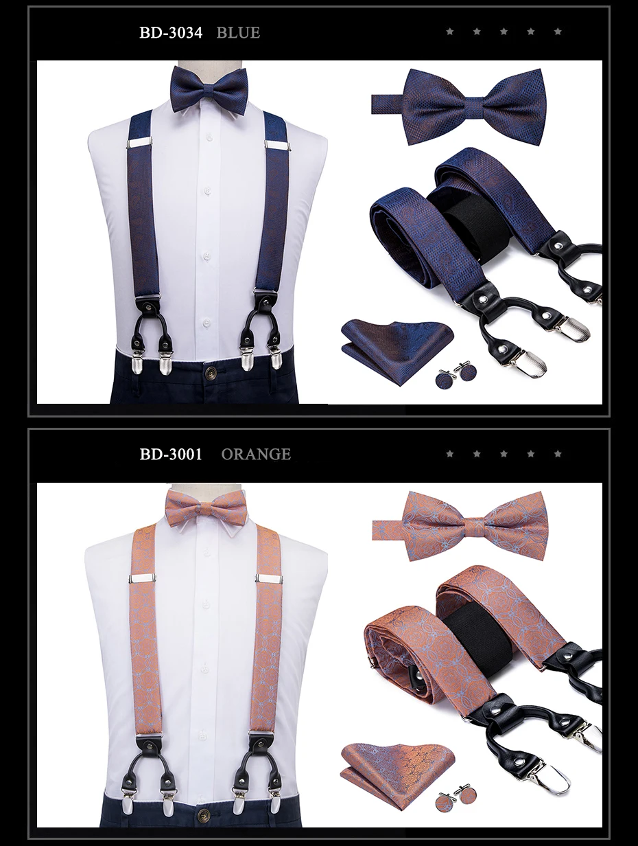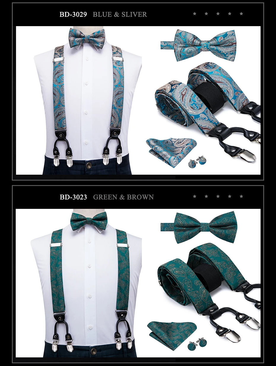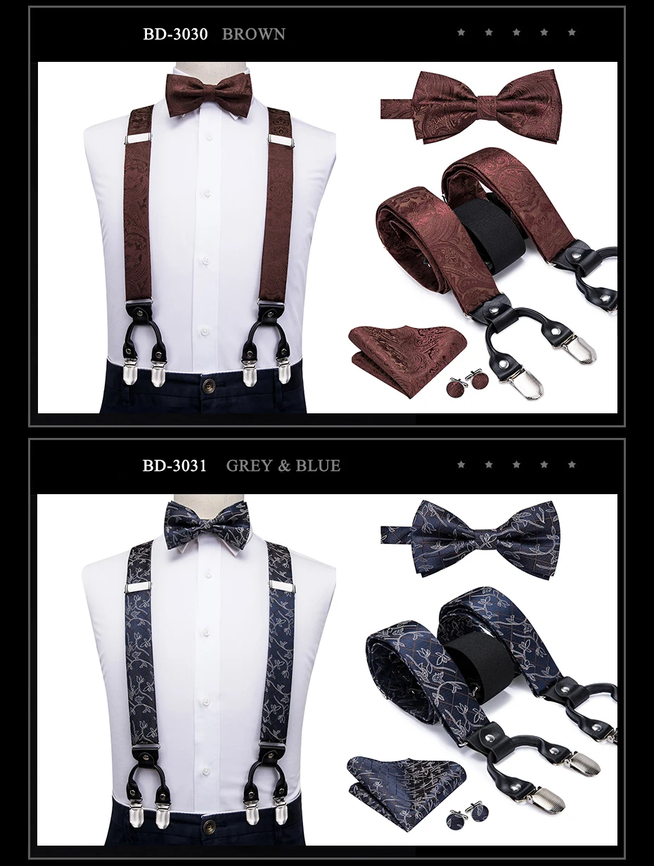 BD-3021, Hi-Tie, шелковые, для взрослых, мужские подтяжки, галстук, набор, кожа, металл, 6 зажимов, подтяжки, золотисто-коричневые, Пейсли, Эластичные подтяжки для мужчин