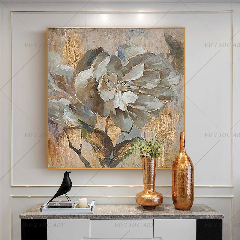 100% ручной работы Золотой коричневый цветок картина маслом на холс...