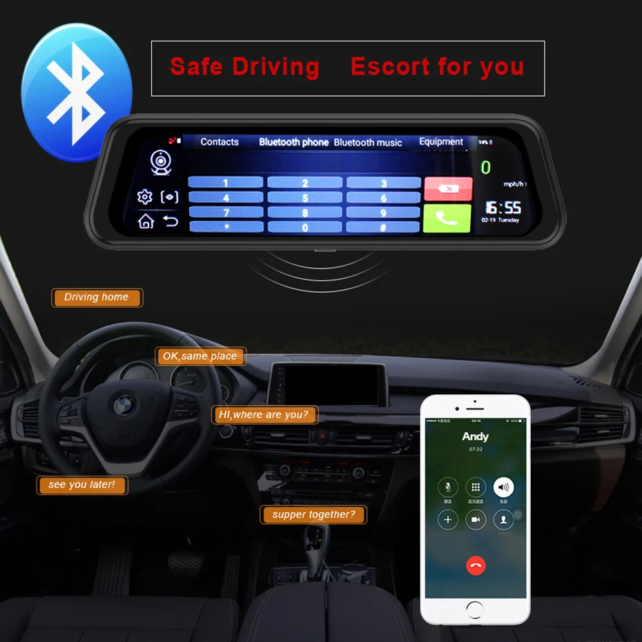 Поддерживает bluetooth hands-free, После сопряжения bluetooth между видеорегистратором и смартфоном, вы можете совершать и принимать звонки непосредственно с самого зеркального видеорегистратора со встроенным микрофоном и динамиком.Вы также можете воспроизводить музыку через Bluetooth.