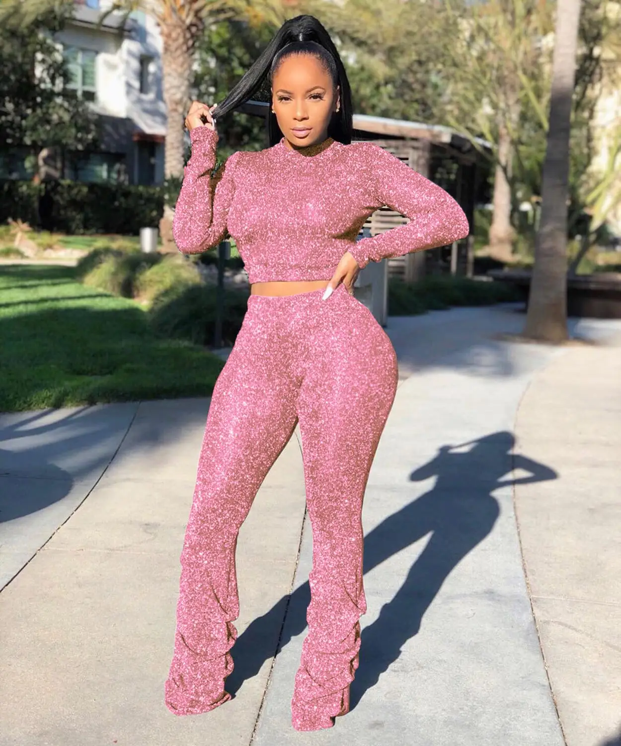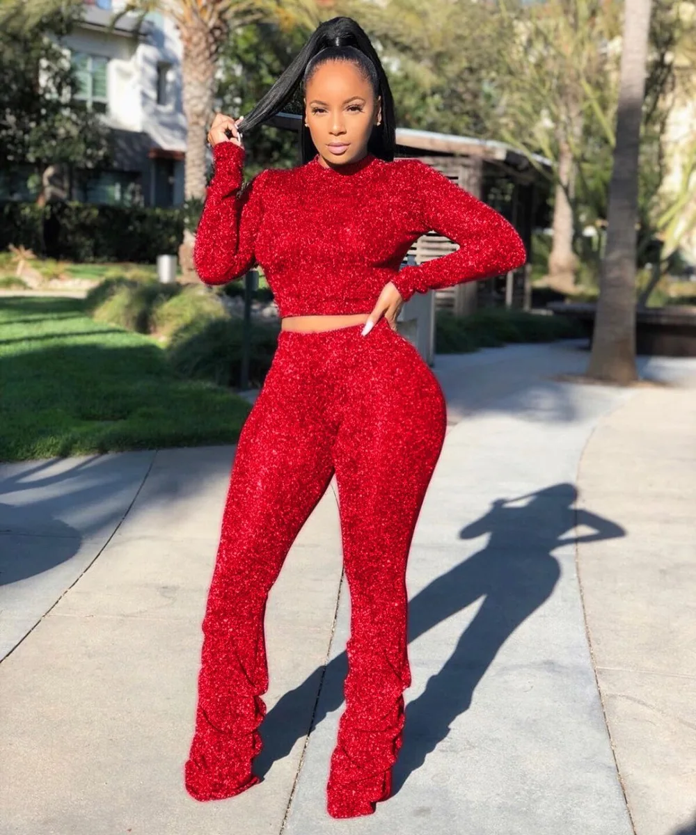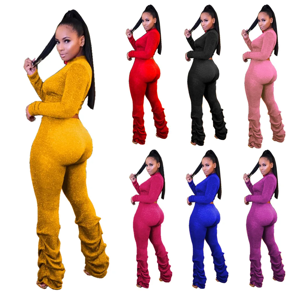 Felyn 2020 Instagram интернет Знаменитости 2 шт. Женский комплект однотонные блестящие короткие топы с круглым вырезом Длинные брюки сексуальные наряды