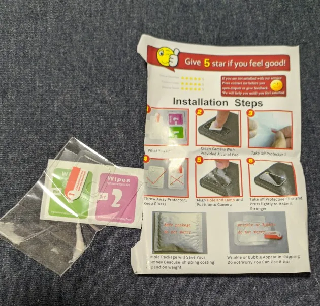 Пришла посылка быстро. Защита подходит для камеры. Брал для вп6. Но это НЕ СТЕКЛО, А ПЛЕНКА. Толстая пленка. Очень жаль. Хотелось бы иметь стекло. Поэтому я решил не ставить пока что эту пленку, а заказал стекло для ксиоми. По размерам такая же почти как и эта пленка, но правда без выреза для светодиодов. Но зато стекло. В общем, здесь размеры подходят, но продают не стекло защитное, а пленку. Правда толстая. Будьте внимательны. А так все хорошо.