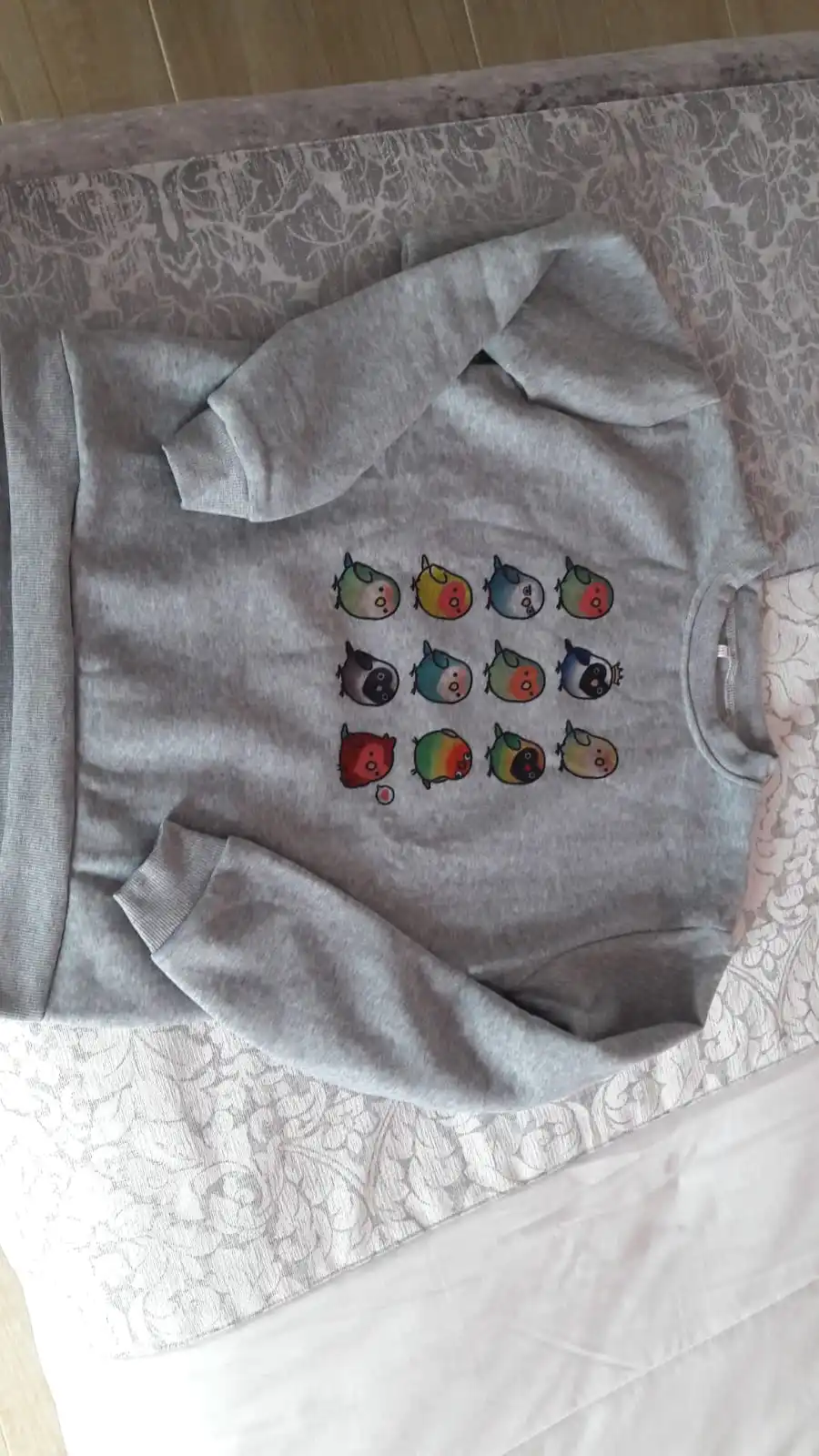 Очень красивый свитшот. Принт не является наклейкой, материал плотный и теплый, но полиэстер. Я ношу европейский размер 38, заказал свитер XL и он хороший, может быть длиннее.