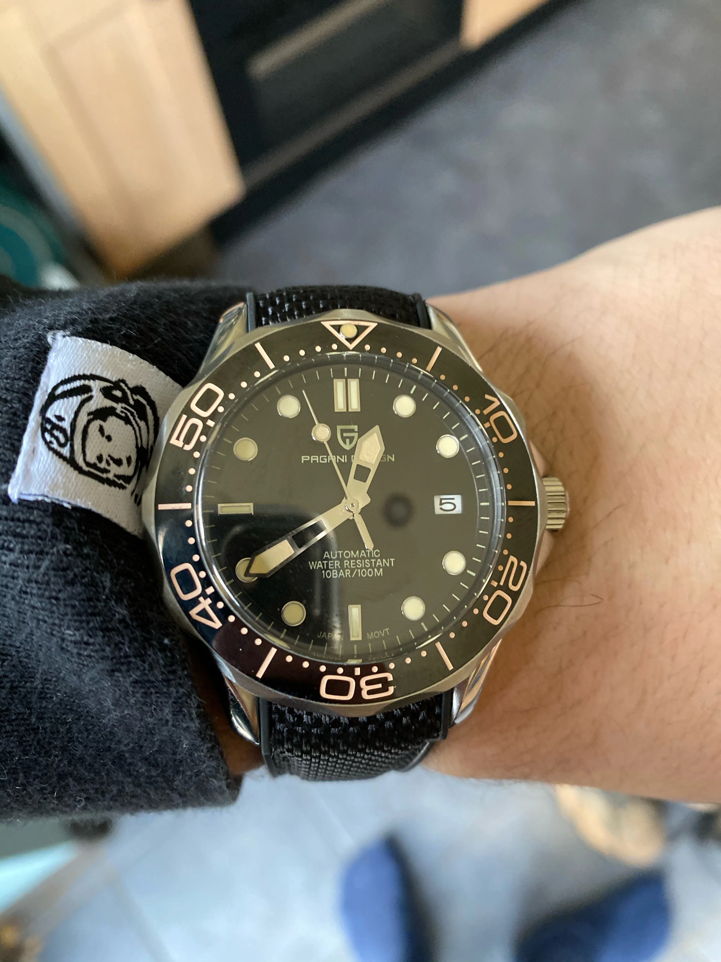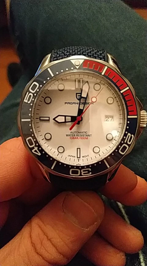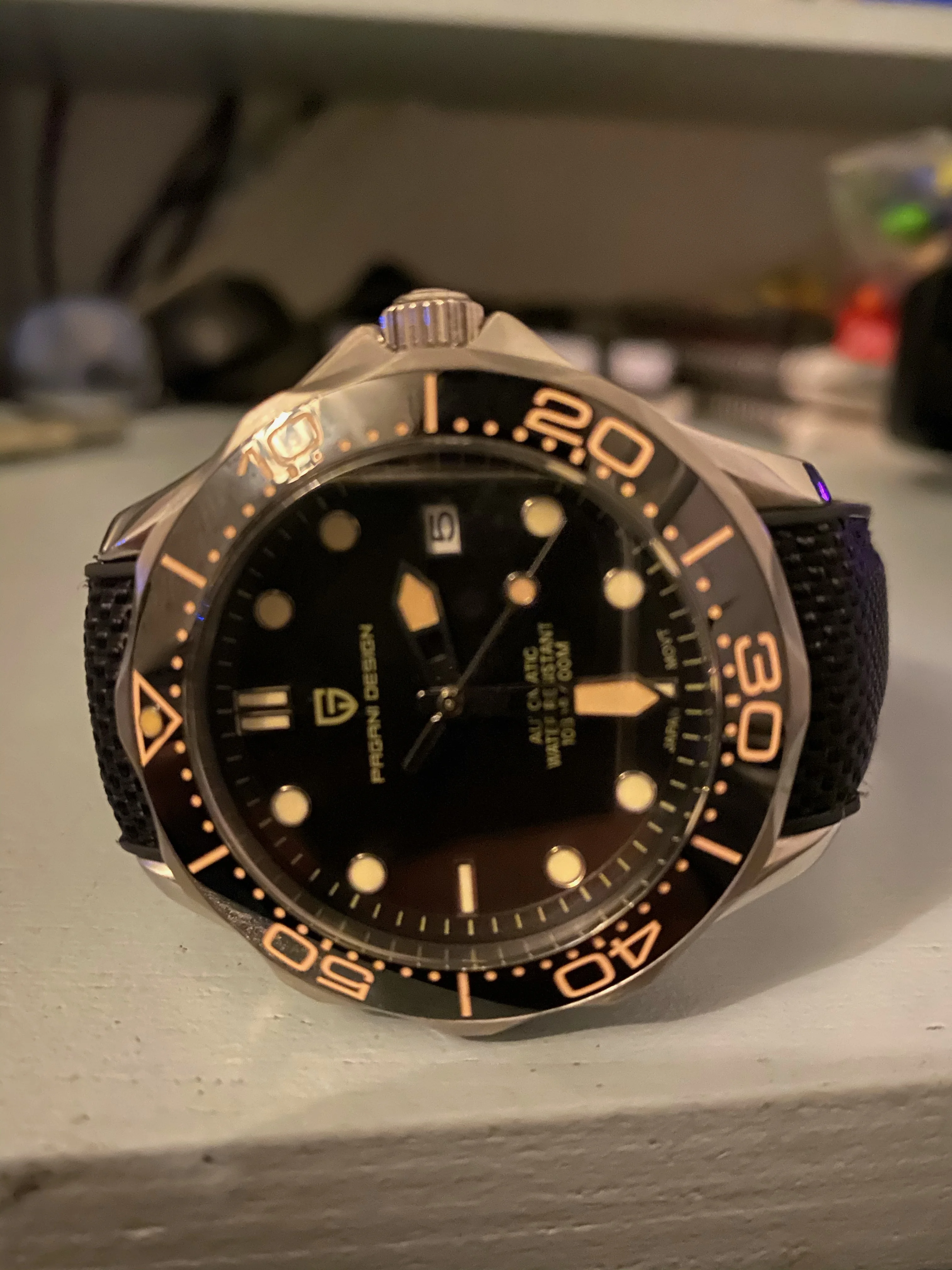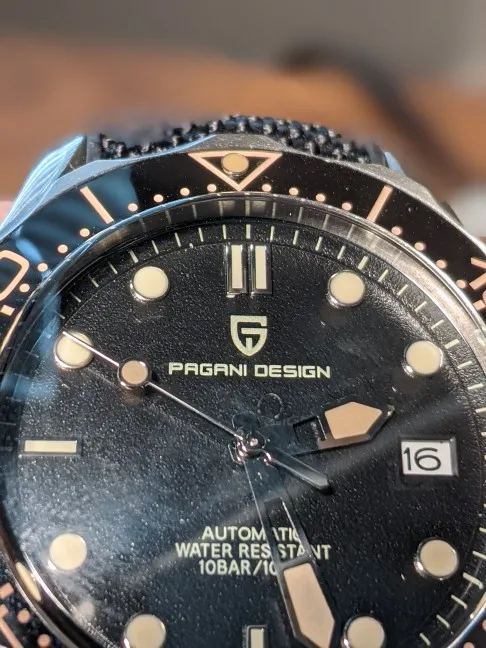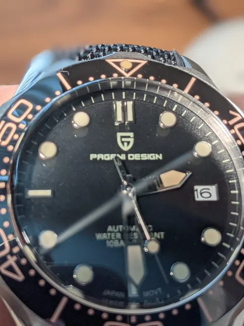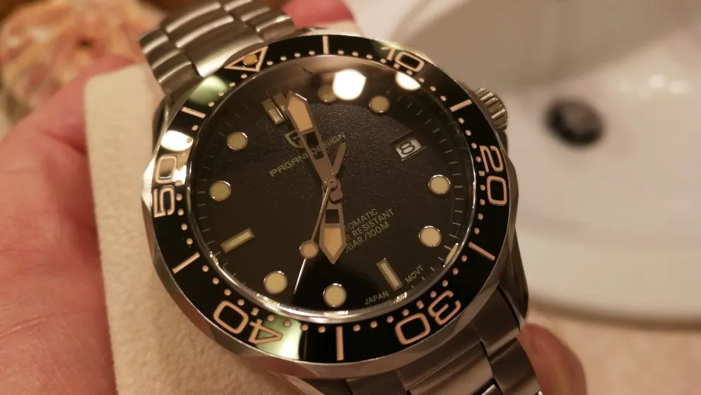Часы-это то, что вы ожидаете за цену и за Пагани. Ремешок для часов удобно сидит вокруг запястья. БЕЗЕЛЬ для дайвинга выглядит немного дешево. Винтовая головка работает довольно гладко. ЛЮМ в лучшем случае Довольно средний. Если у вас должен быть вид моряка NTTD, это, возможно, самый дорогой способ приблизиться к нему.