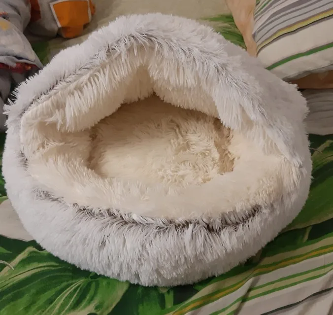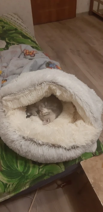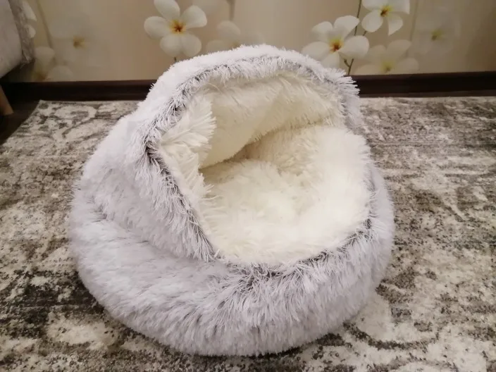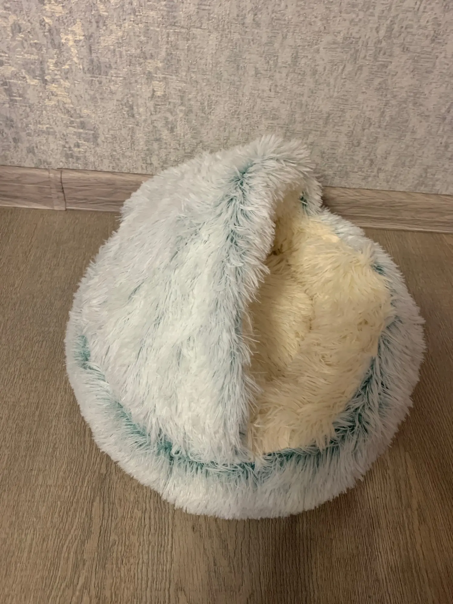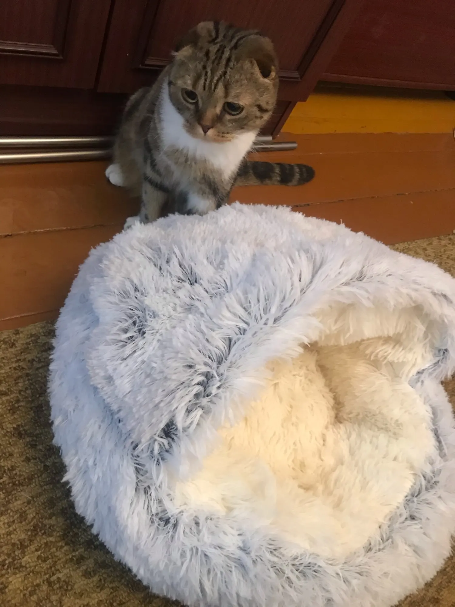 Домик пришёл быстро, свернутым в клубок в прозрачном пакете. Чистенький, аккуратный, единственное с деформированным верхом. Но после стирки принял нужную форму. Домик великолепный! Мягкий, воздушный, внутри хорошо набит наполнителем, дно объёмное, ничего больше вовнутрь класть не нужно! Мне очень повезло, что продавец положил именно с таким удачным дном(читала в предыдущих отзывах, оно попадается совсем плоское). Сшит аккуратно, ткани нежнейшие, без запаха. Даже для небольшой кошечки надо брать 50 см, не меньше! Я довольна, хоть забирайся в него и живи сама, потому что мои кот и кошка обходят эту чудо-кровать за метр! А, если сажаю силом, то воспринимают буквально, как наказание! Поджимают уши, выпячивая глаза. И, при удобном случае, убегают наутек! Ни стирка, ни кошачья мята пока не помогли. Может быть нужно время, а может менее привередливые питомцы Однозначно рекомендую, этот домик будет украшением вашего интерьера, а, если ещё в нем будет спать ваш зверь, то совсем хорошо!) ☺️