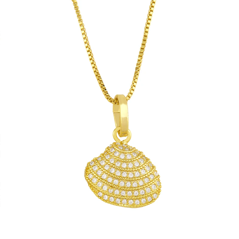 Ожерелье FLOLA женское с кубическим цирконием, круглое, с подвеской в виде ракушки, с золотыми кристаллами