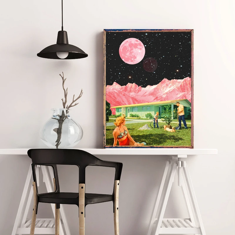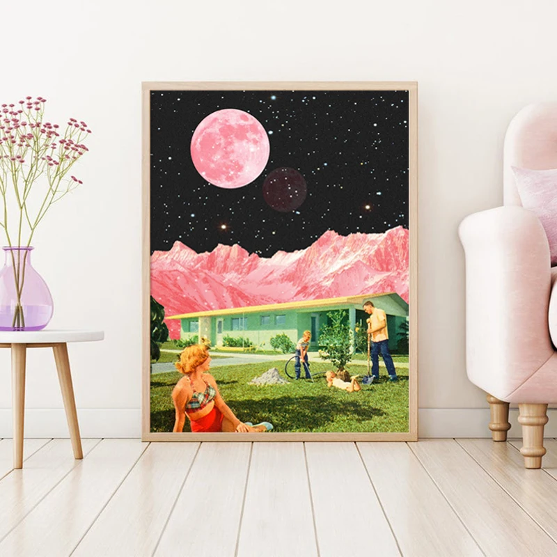 Винтажная картина Сюрреализм розовая Луна природа пейзаж постер психоделическая Настенная картина Печать на холсте семейная картина домашний декор
