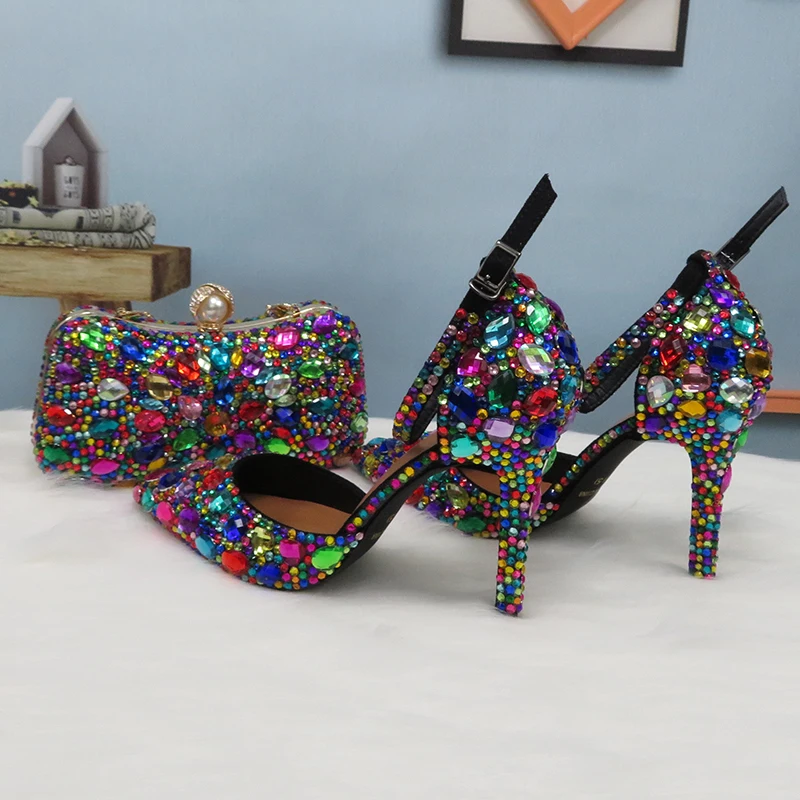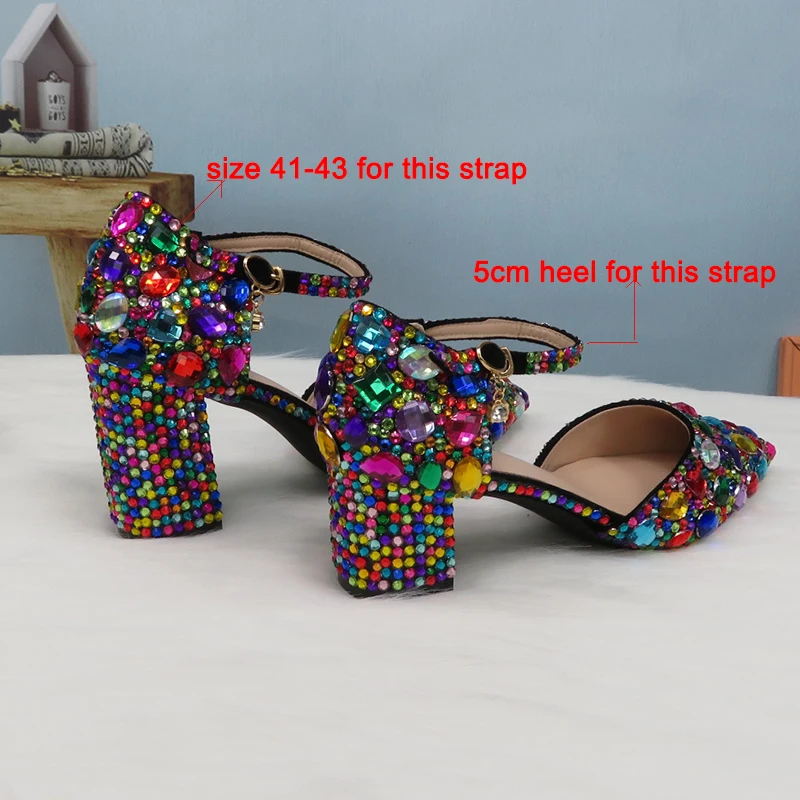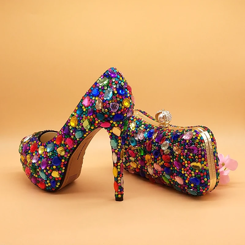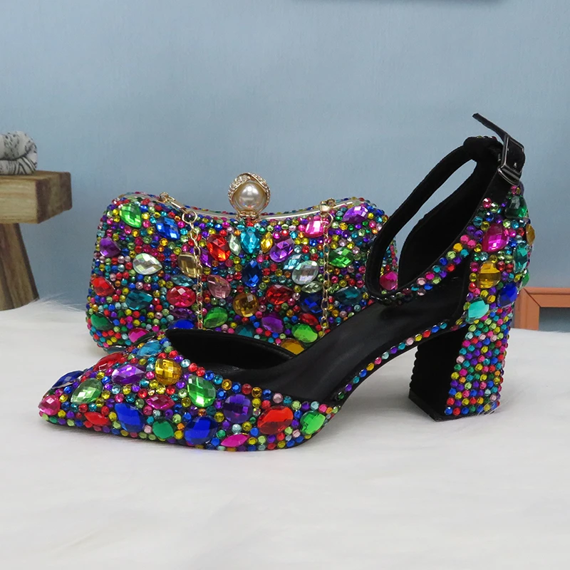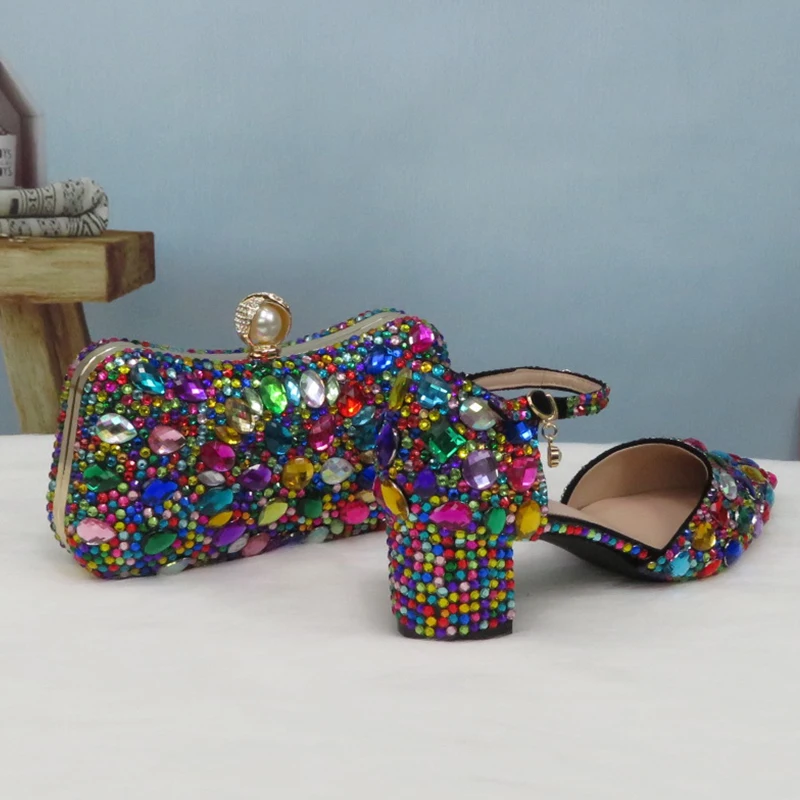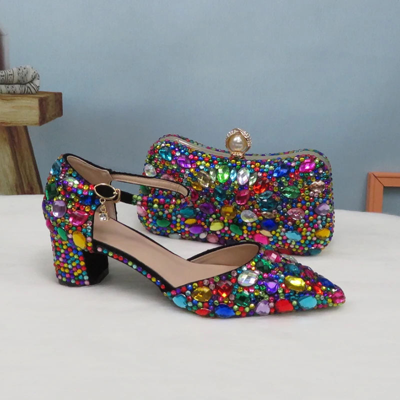 Женские свадебные туфли с подходящей сумкой, разноцветные туфли-лодочки на толстом высоком каблуке с кристаллами, очень большие размеры