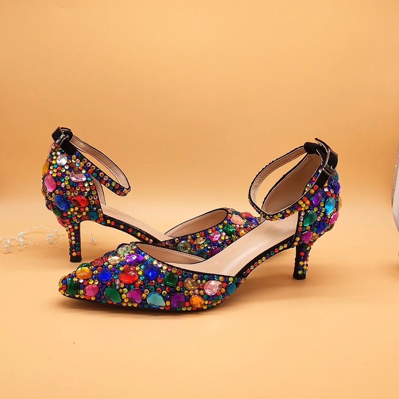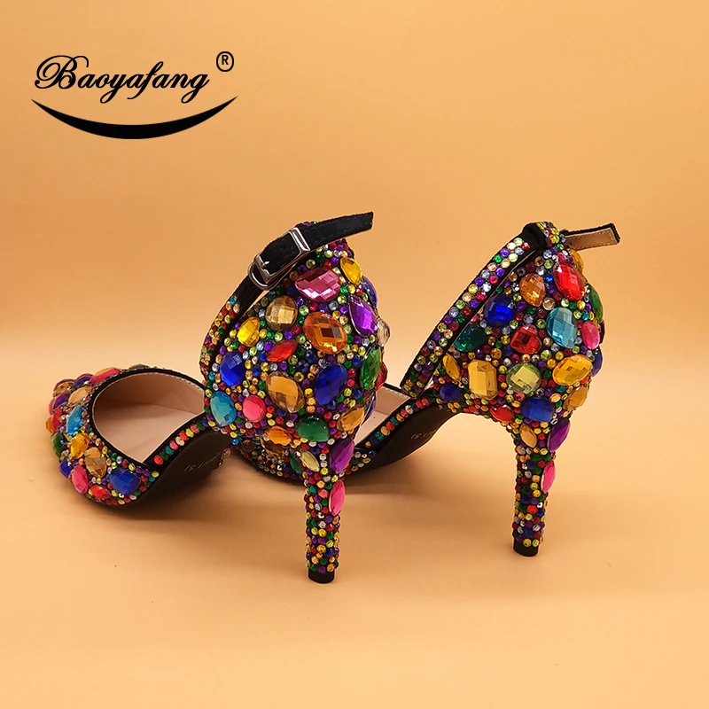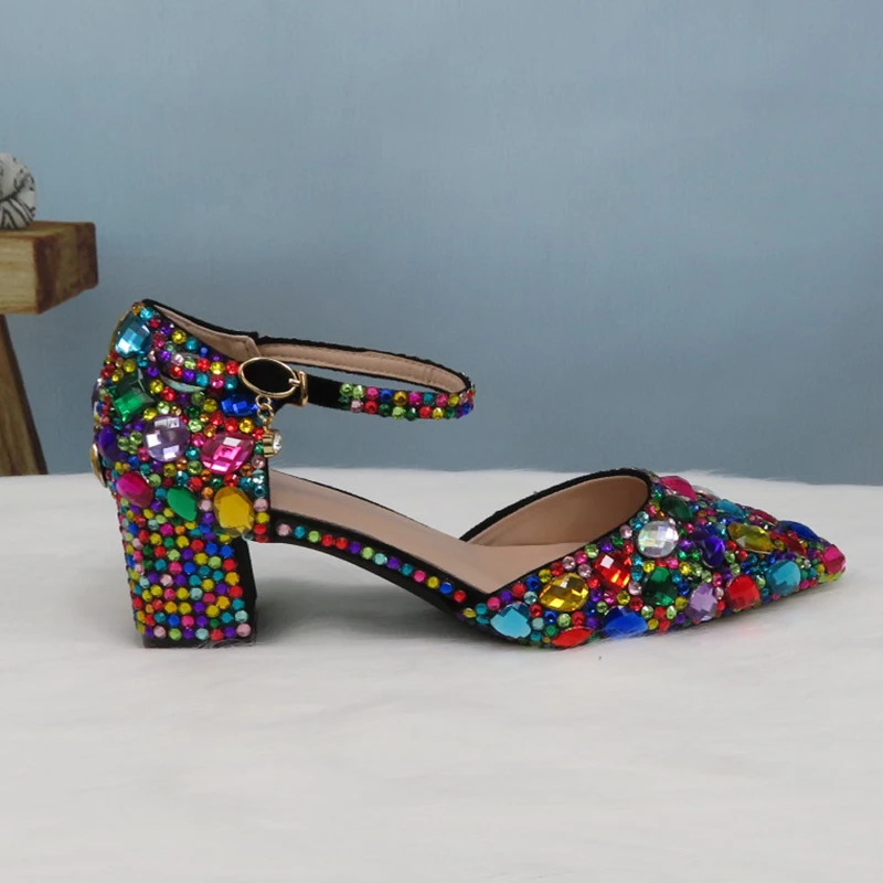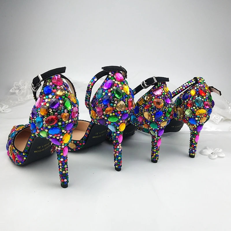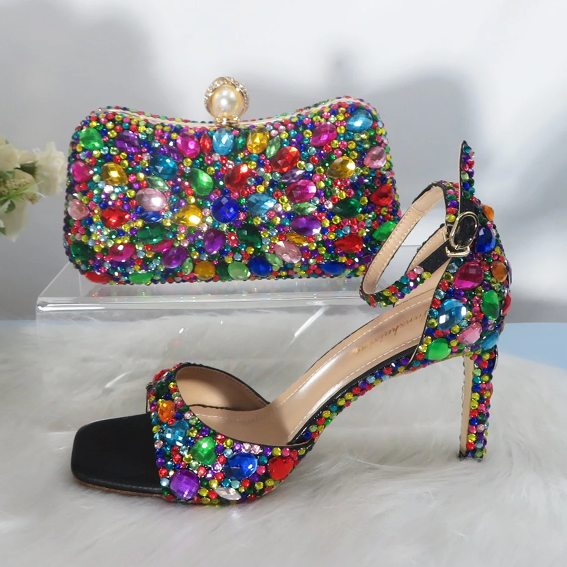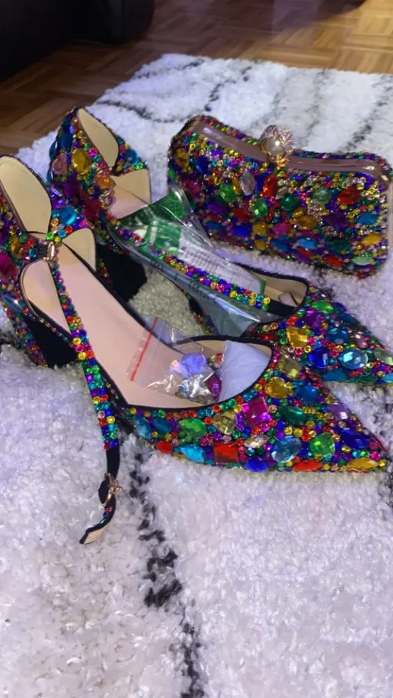 Женские свадебные туфли с подходящей сумкой, разноцветные туфли-лодочки на толстом высоком каблуке с кристаллами, очень большие размеры