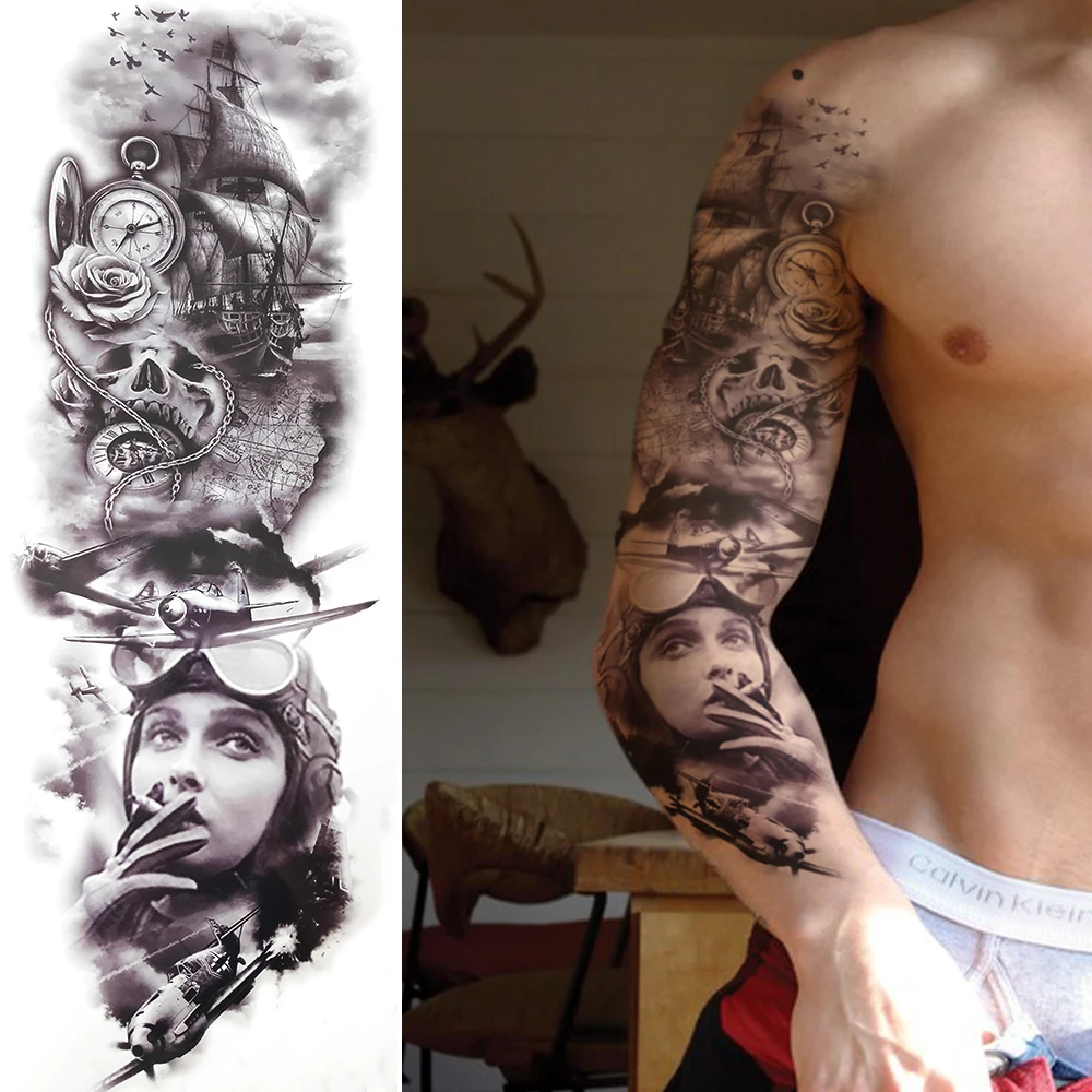 Временные тату-наклейки 3D на всю руку для мужчин, женщин, мужчин, взрослых, военный корабль, компас, имитация тату, рукав, тату, бедра