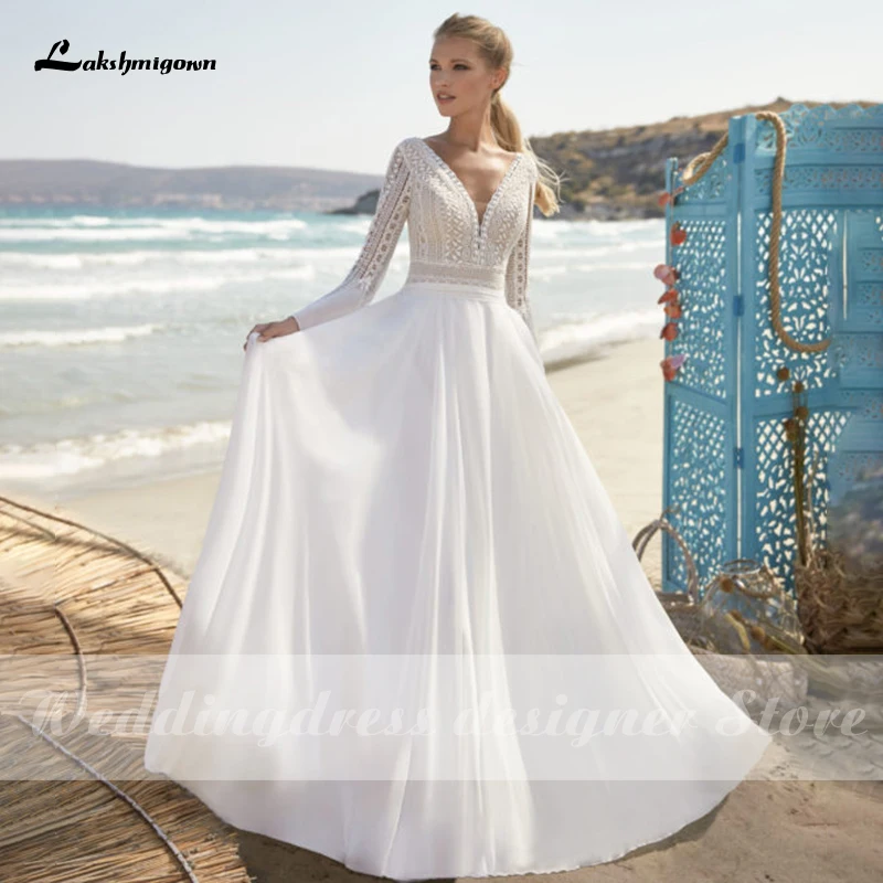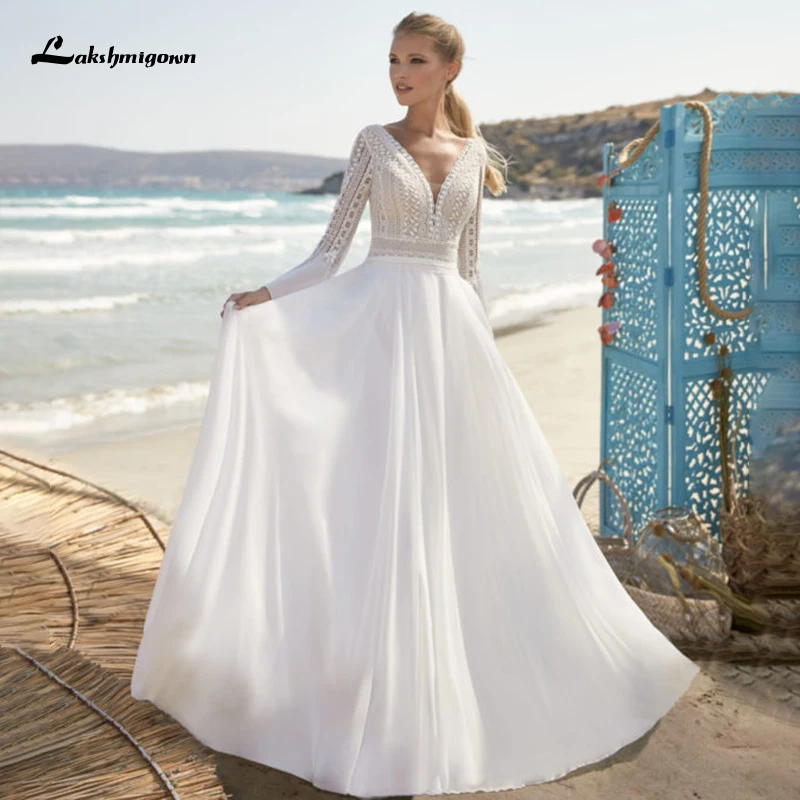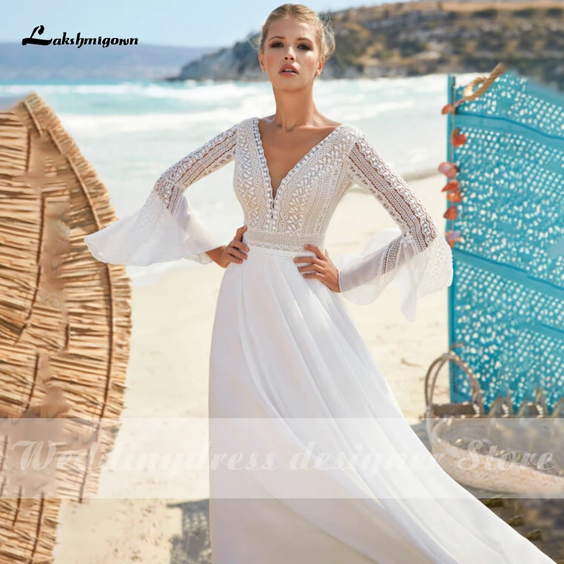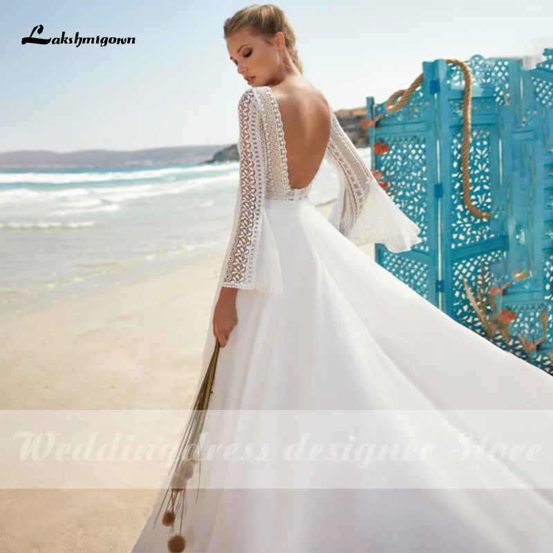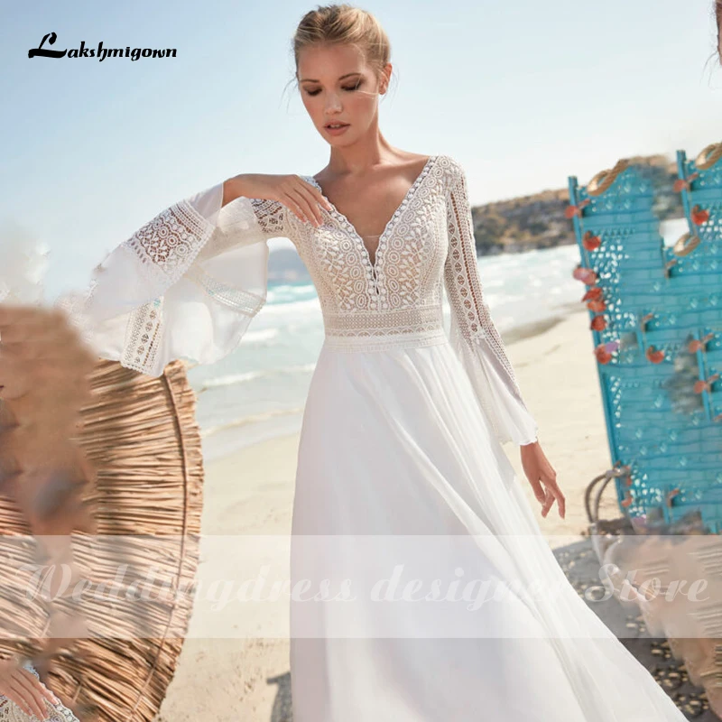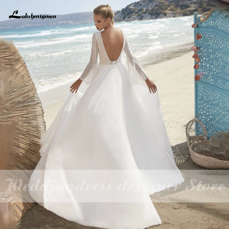 Свадебные платья Lakshmigown, шифоновые, с длинным рукавом, V-образным вырезом, открытой спиной, в стиле бохо, а-силуэта, на заказ