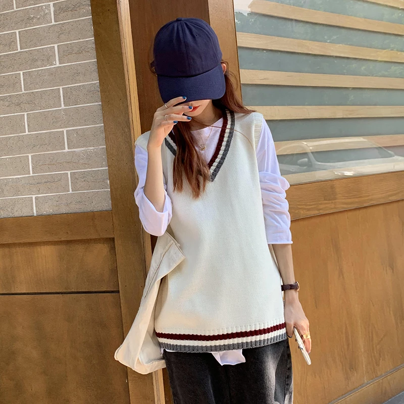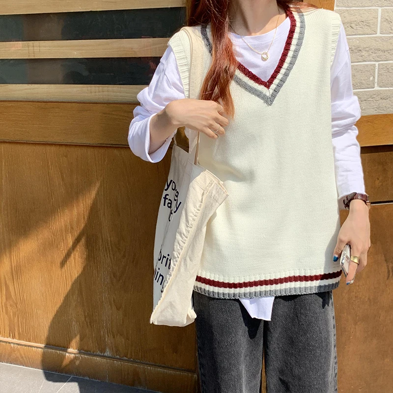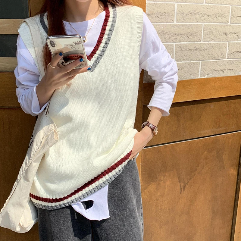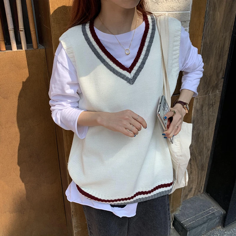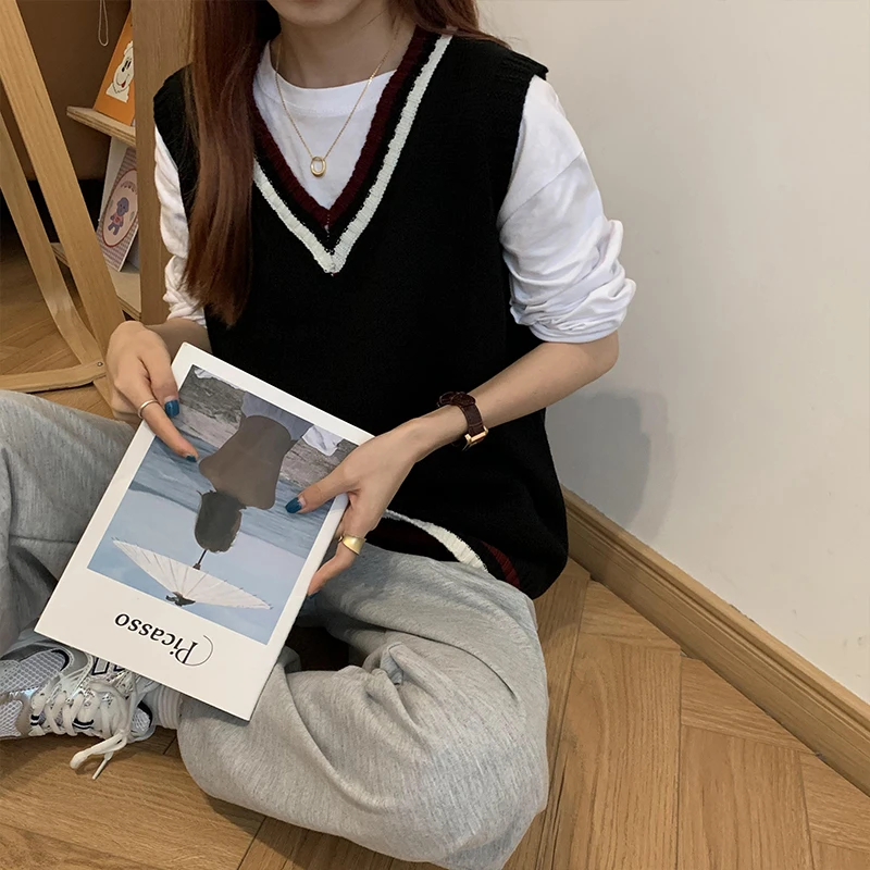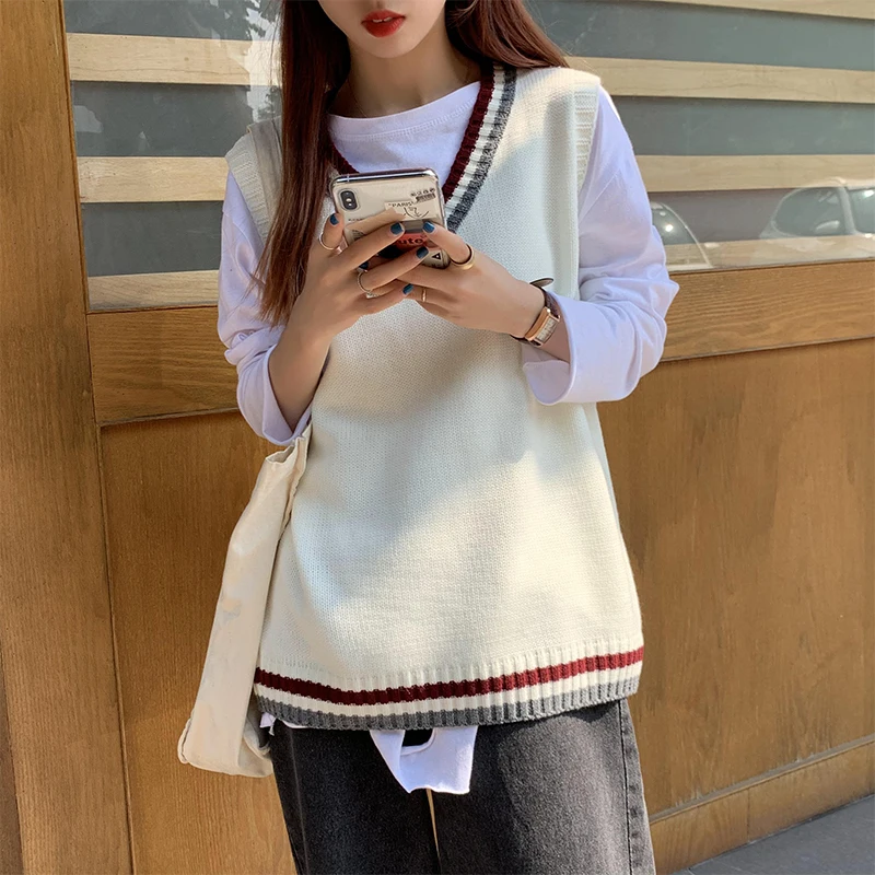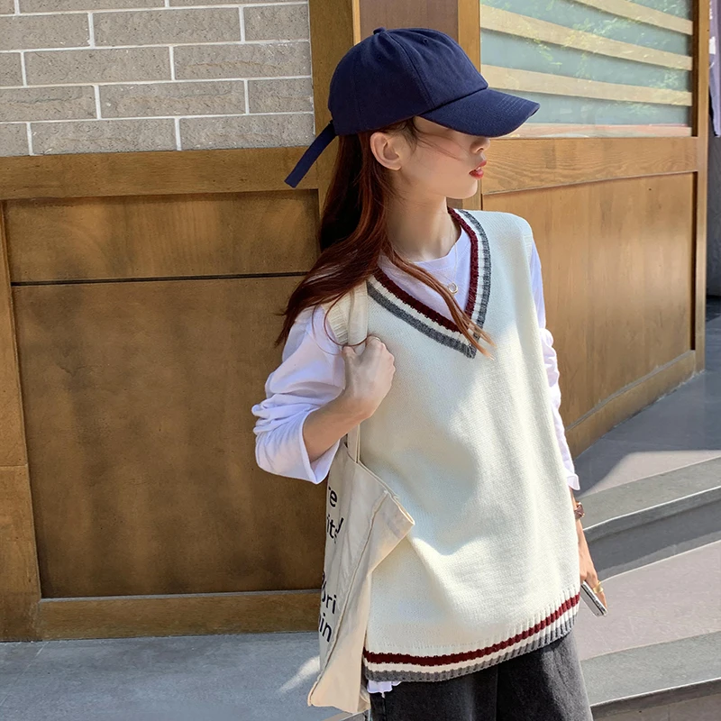 Осень 2020, жилет без рукавов, повседневный женский жилет в Корейском стиле, вязаный свитер в полоску, жилет в стиле преппи, свитер, жилет