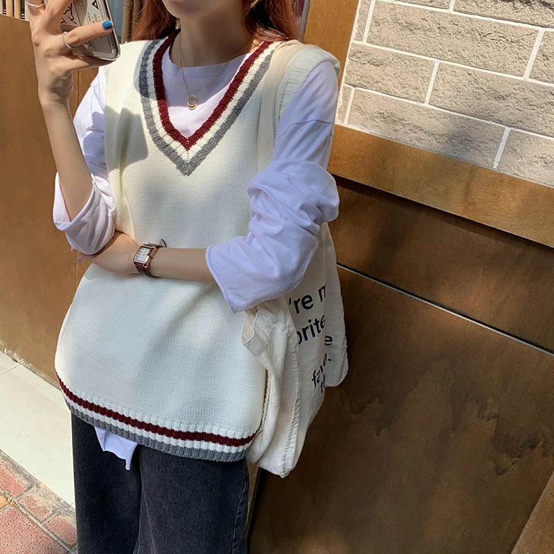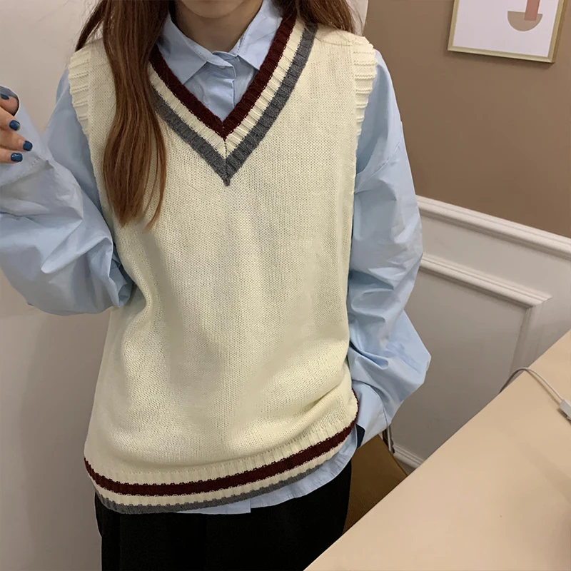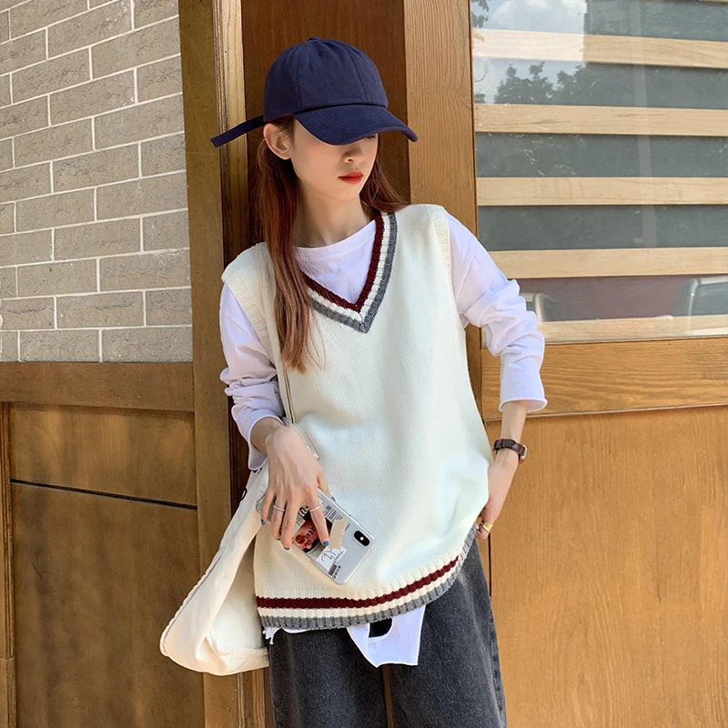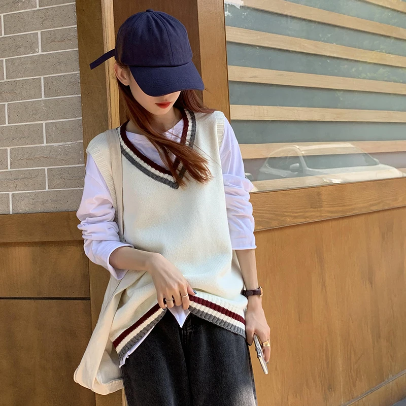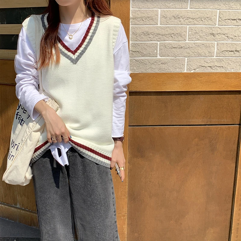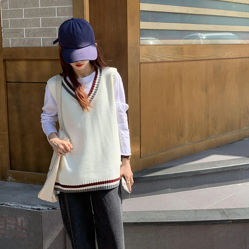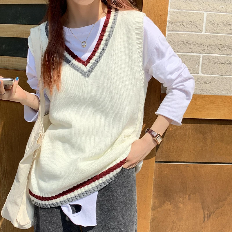 Осень 2020, жилет без рукавов, повседневный женский жилет в Корейском стиле, вязаный свитер в полоску, жилет в стиле преппи, свитер, жилет