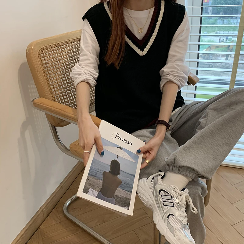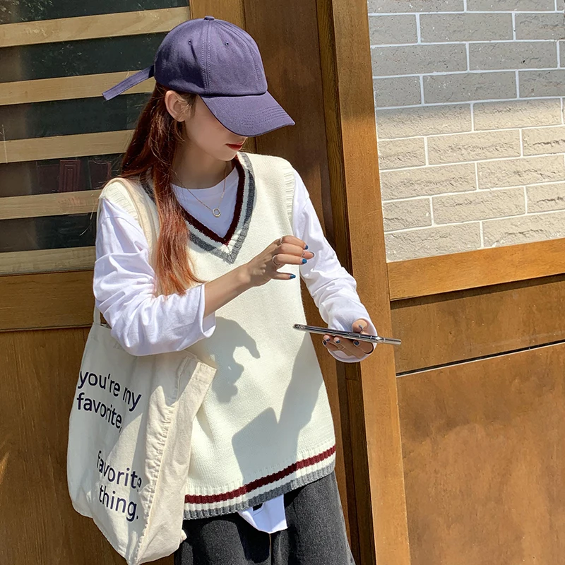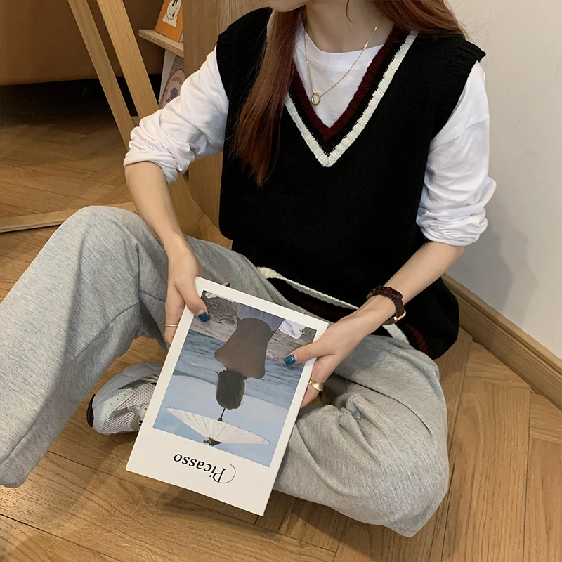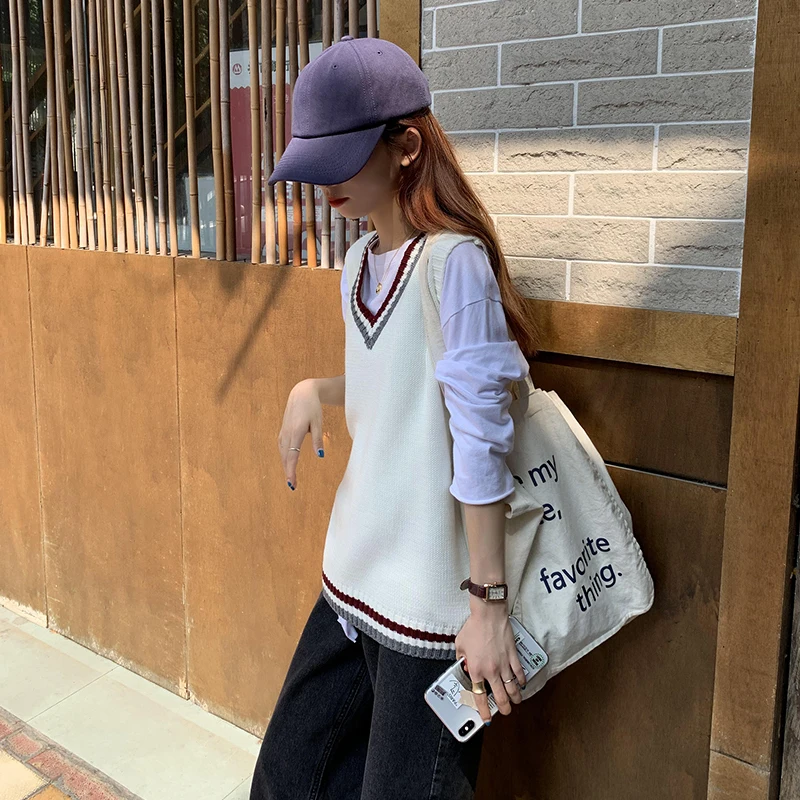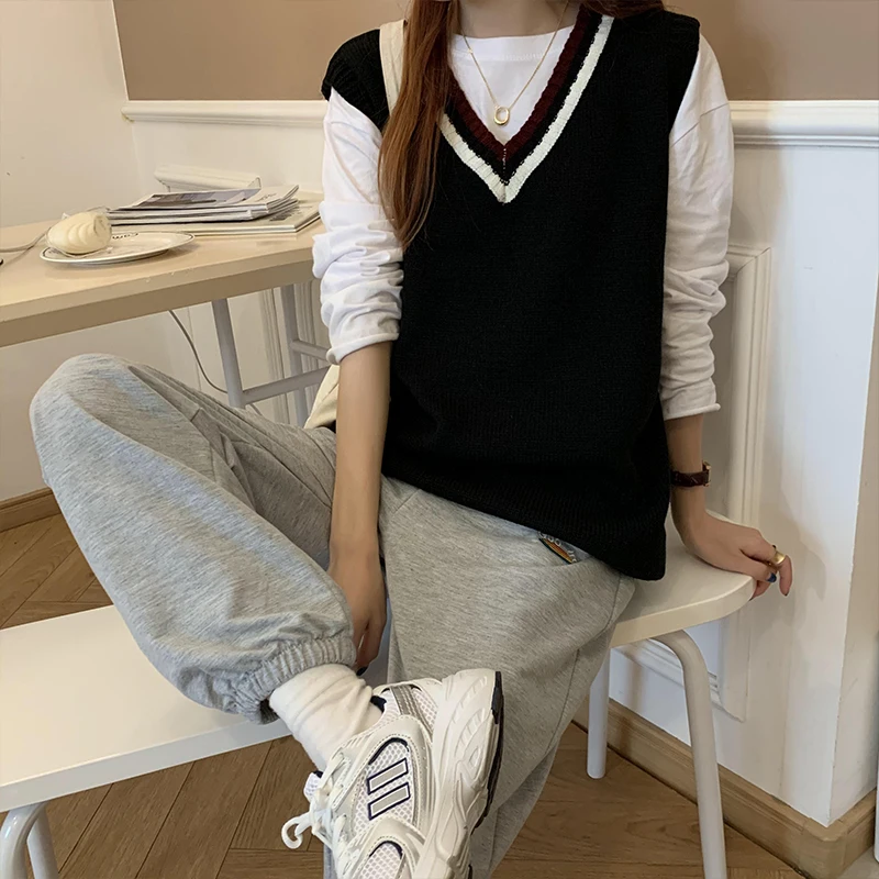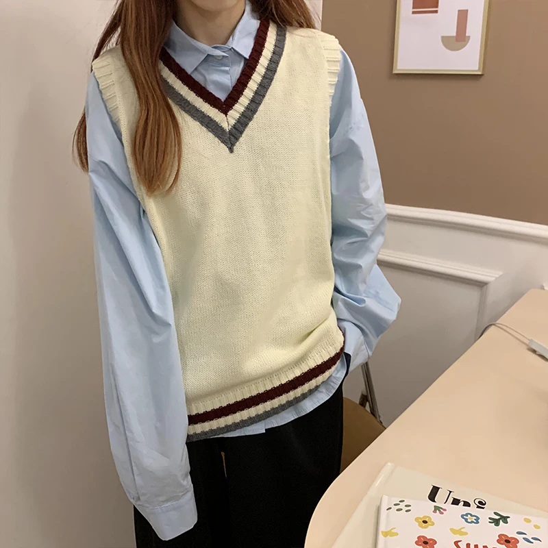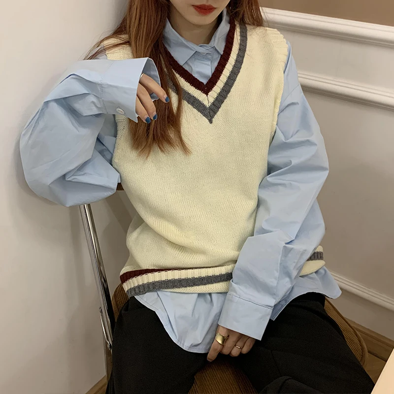 Осень 2020, жилет без рукавов, повседневный женский жилет в Корейском стиле, вязаный свитер в полоску, жилет в стиле преппи, свитер, жилет