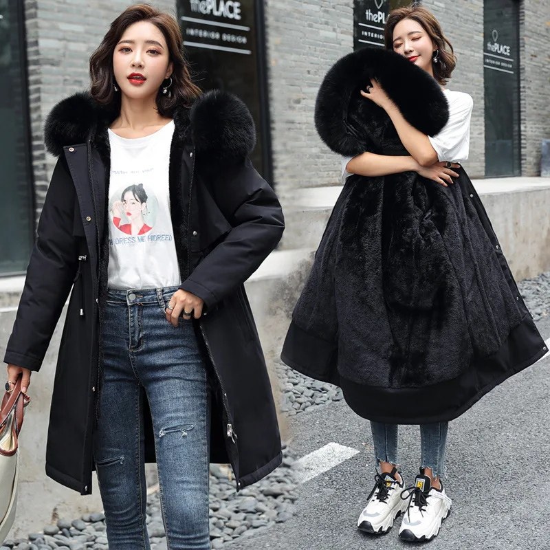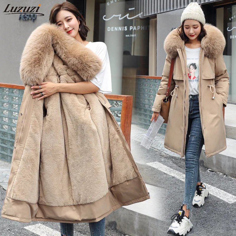 Новая парка Luzuzi 2022 с хлопковой подкладкой Паркер модная зимняя куртка с регулируемой талией с меховым воротником Женская парка средней длины с капюшоном пальто