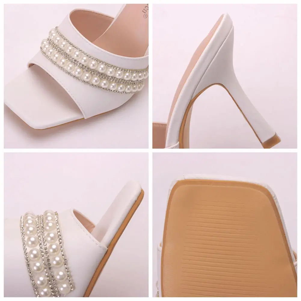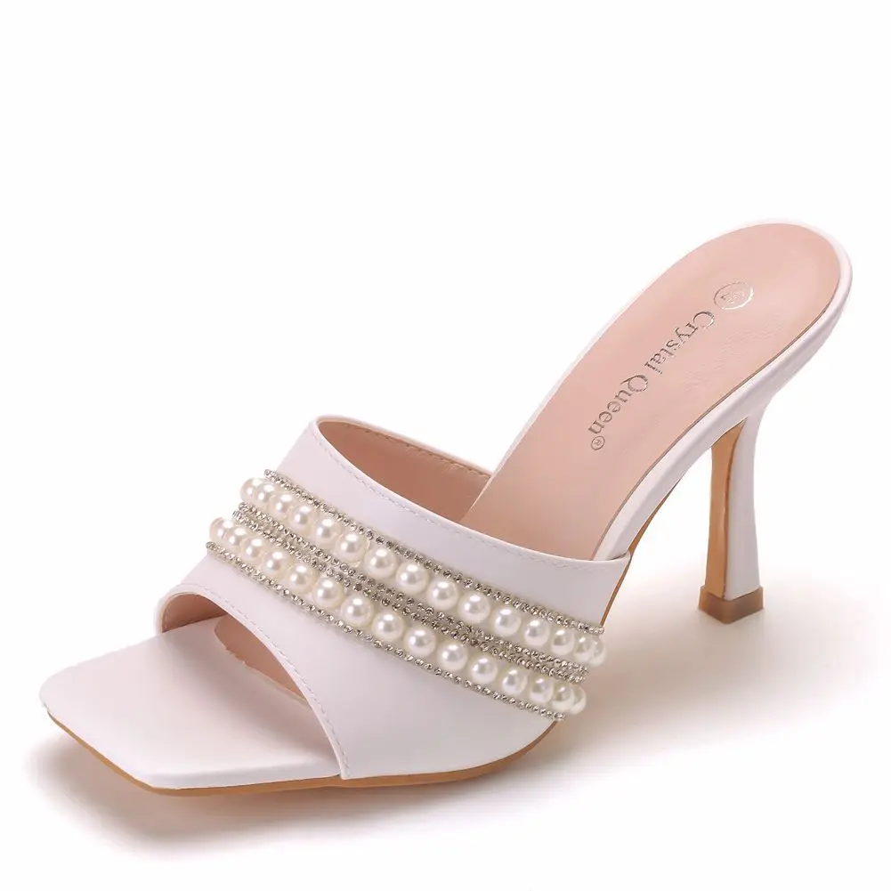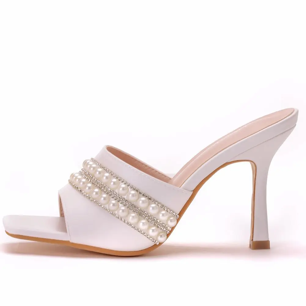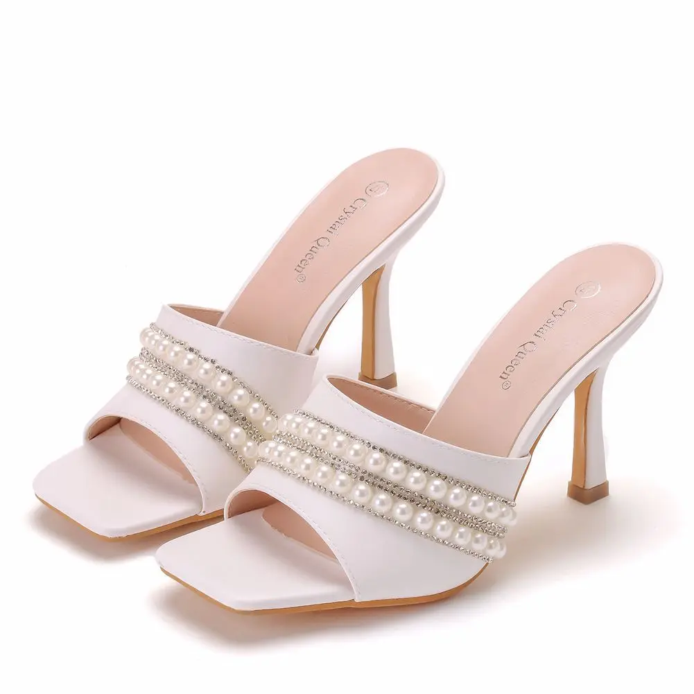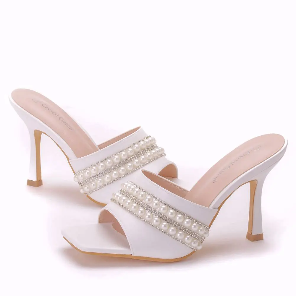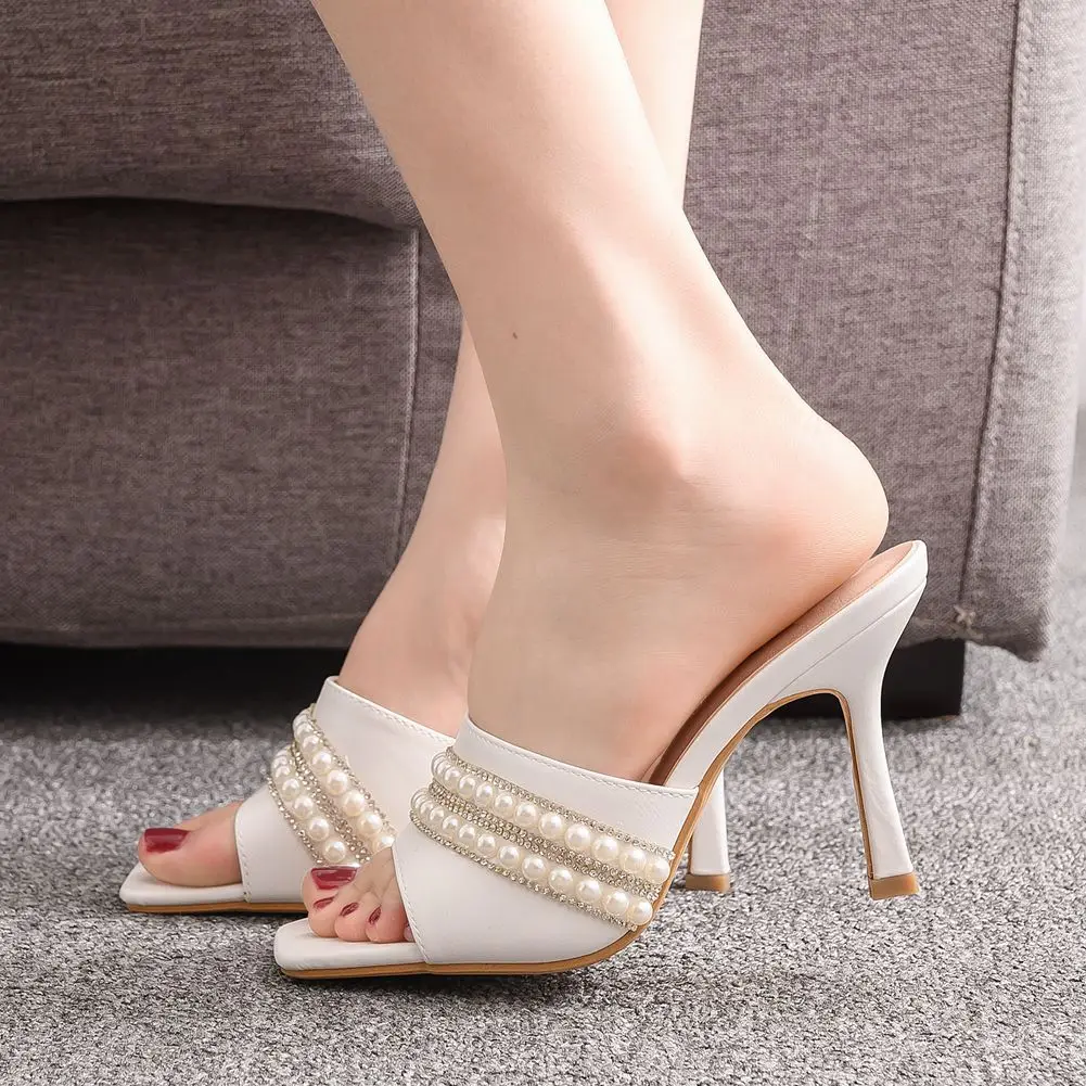 Женские босоножки с жемчугом, туфли на шпильке-шпильке с открытым носком, свадебные туфли больших размеров с белым цветком, лето 2021
