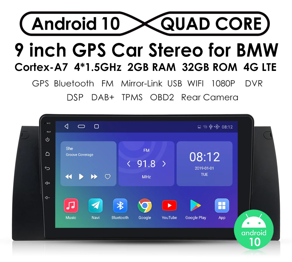 Мультимедийная магнитола для BMW, мультимедийный видеоплеер на Android 10, 4 Гб ОЗУ, 64 Гб ПЗУ, с GPS Навигатором, для BMW 5, E39, E53, X5, 1995-2001, 2002, 2003, 2004, 2005, типоразмер 2 Din