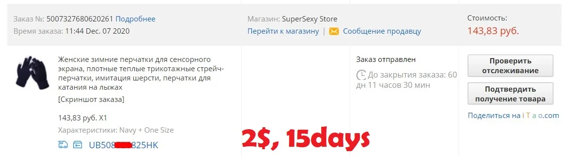 Перчатки супер! Ооочень мягкие и тёплые. Раньше носила кашемировые, в них руки мерзли, а в этих-нет. Мне немного длиноваты в области мизинца, но это небольшая проблема. Телефон на прикосновения в перчатках реагирует, но нужно нажимать сильнее, чем обычно, так что нужно приноровиться. Но я однозначно буду заказывать ещё пару, а может и не однув Краснодарский край дошло за 17 дней с даты заказа.