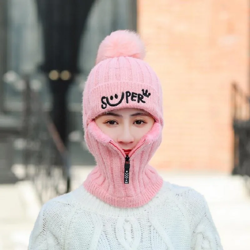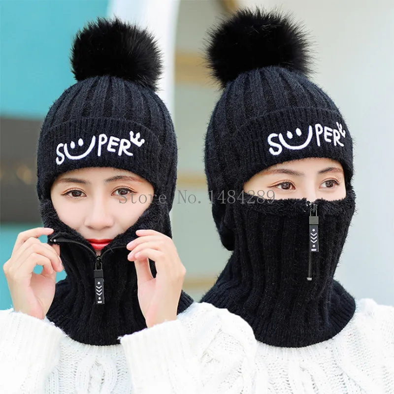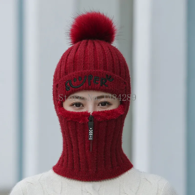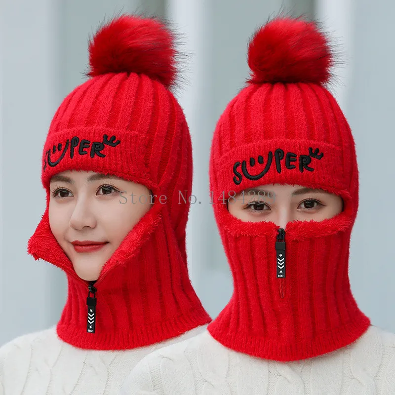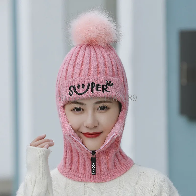 Женские зимние вязаные шапки с меховой подкладкой, теплые зимние шапки для женщин на молнии, сохраняющие тепло Балаклава, Кепка с помпоном, женские шапки