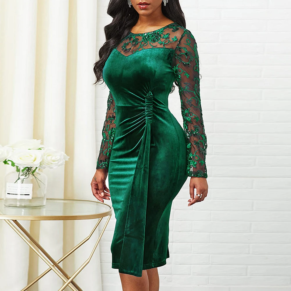 Женское платье размера плюс 5XL, сексуальное прозрачное кружевное лоскутное платье с длинным рукавом для женщин, вечернее облегающее платье миди с рюшами