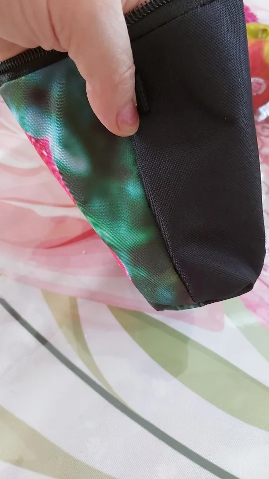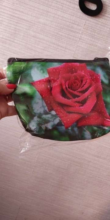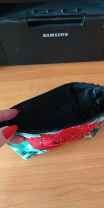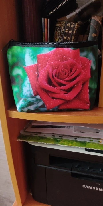 косметичка как косметичка. Обычная. Без кармашков. Рисунок действительно яркий, интересный. Немного кривовато сшито, могли бы постараться. Но это всё мелочи. Вместительная. Я пока пользуюсь другой, эта пусть полежит, подождёт своего часа ))) Сейчас, пока фотала, ещё раз восхитилась розой, и правда красавица, покрытая капельками росы. Рекомендую )))