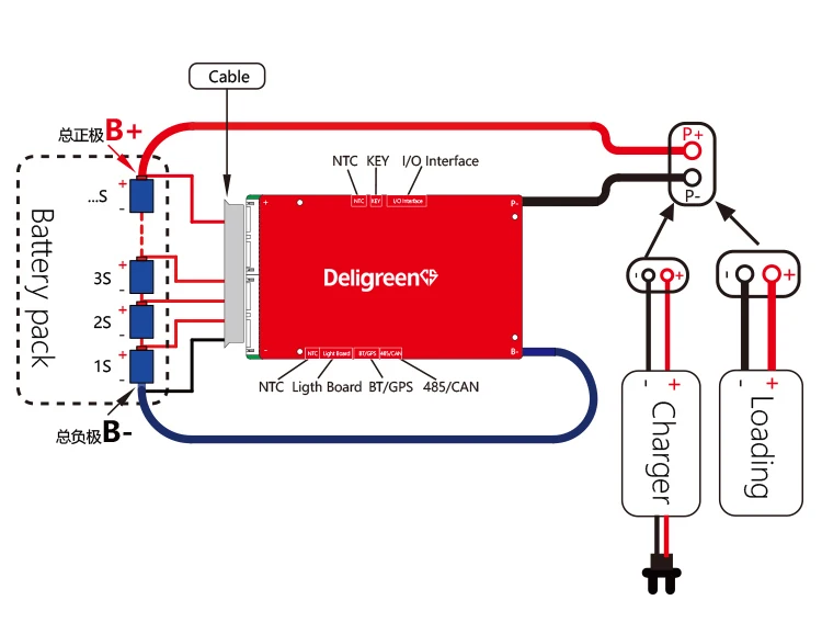 ◆Кабель начинается с черного тонкого провода, соединяющего B- , второй провод (тонкий красный провод) подключен к положительному полюсу первого аккумулятора, И положительный полюс каждого аккумулятора подключается в свою очередь до тех пор, пока последний красный провод не подключен к B +;