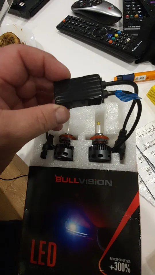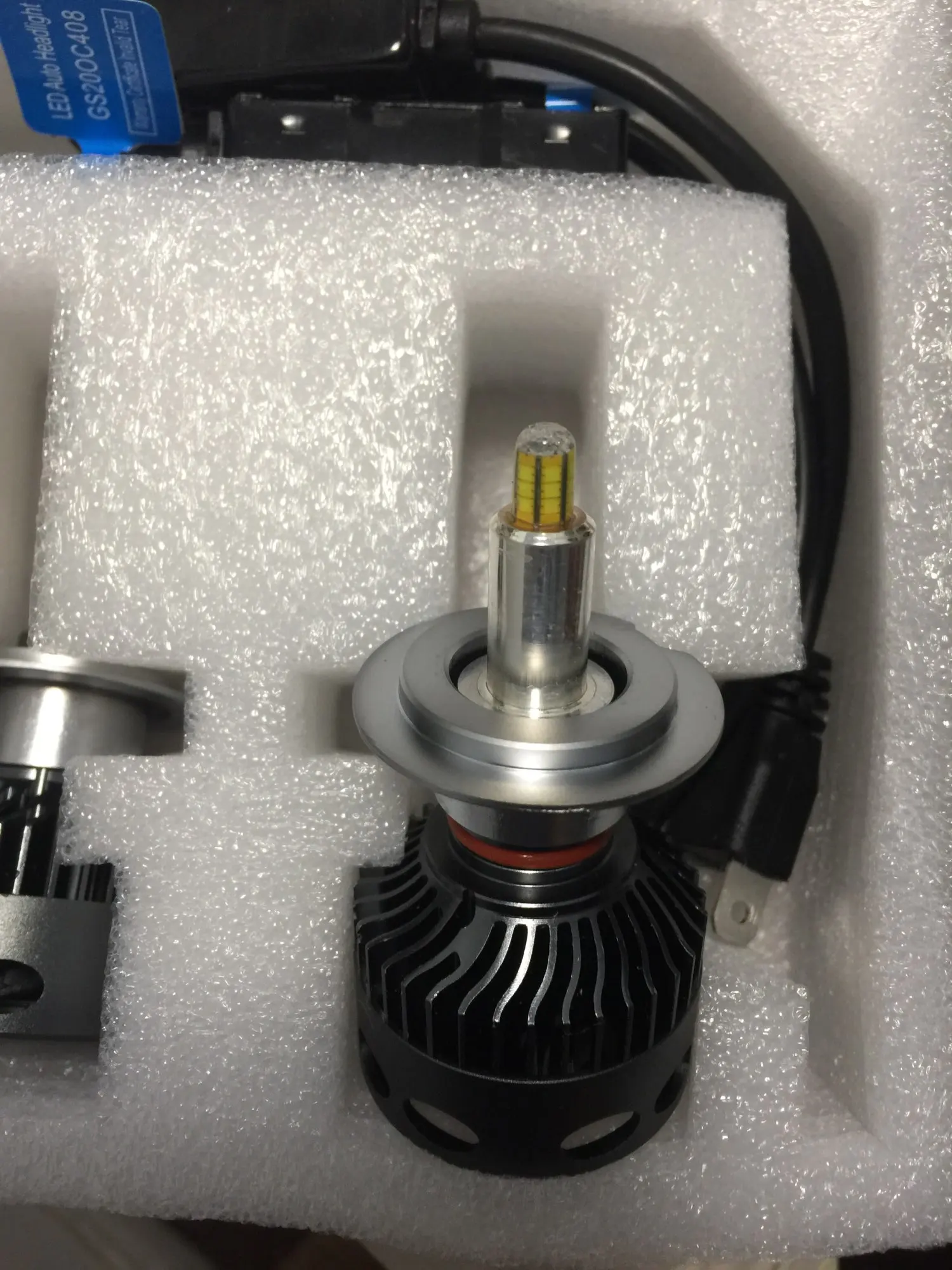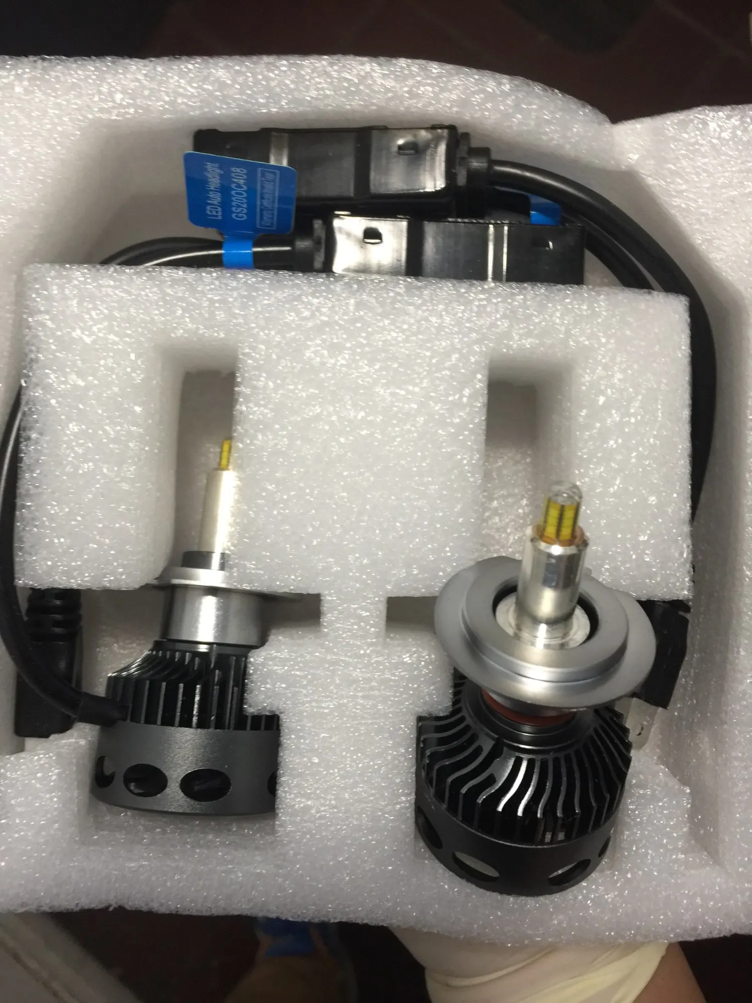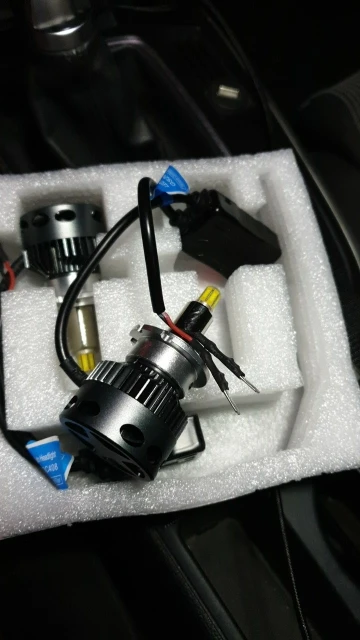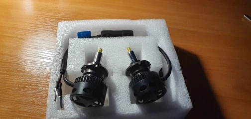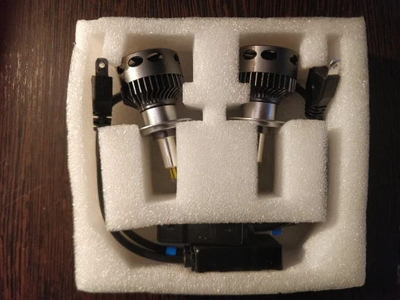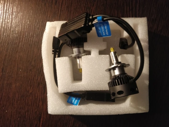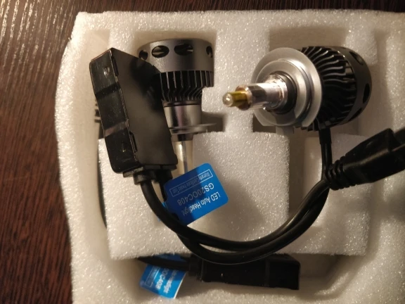 Хорошая брендированная коробка с характеристиками. Металл очень солидный по ощущениям. Нагреваются на удивление незначительно на открытом воздухе, посмотрим как будет в фаре. Выносные блоки греются, но на воздухе тоже ничего критичного, надо смотреть в фаре. Ток потребления - 2.1-2.2 ампера при 14.5 вольт, светят вроде ярко, но пока не поставил трудно сказать. Явно ярче других светодиодных ламп, в т.ч. брал подобной конструкции на 16 тыс.люмен