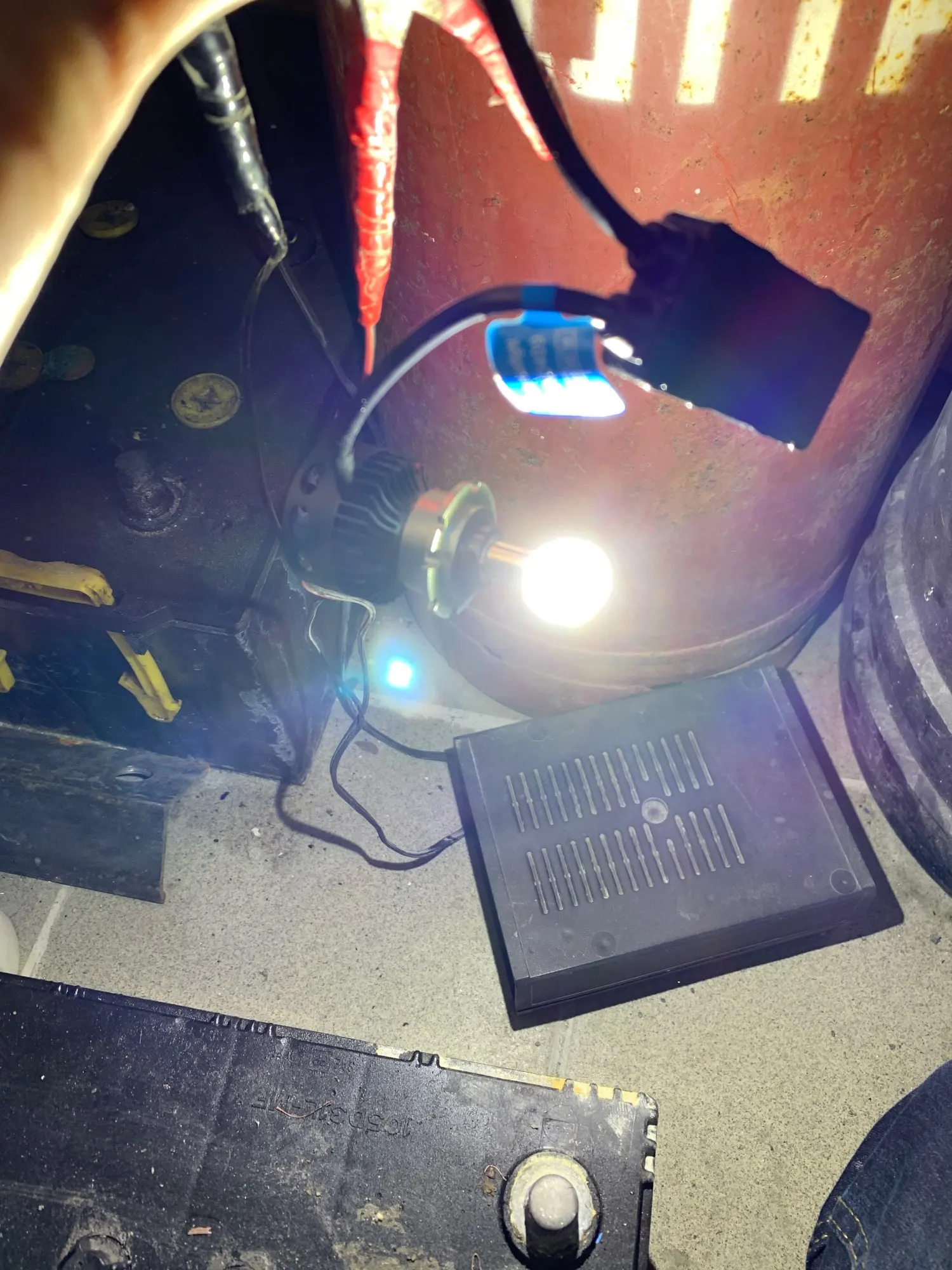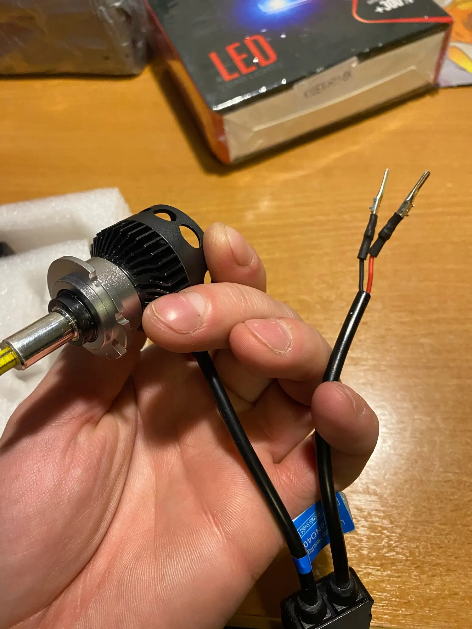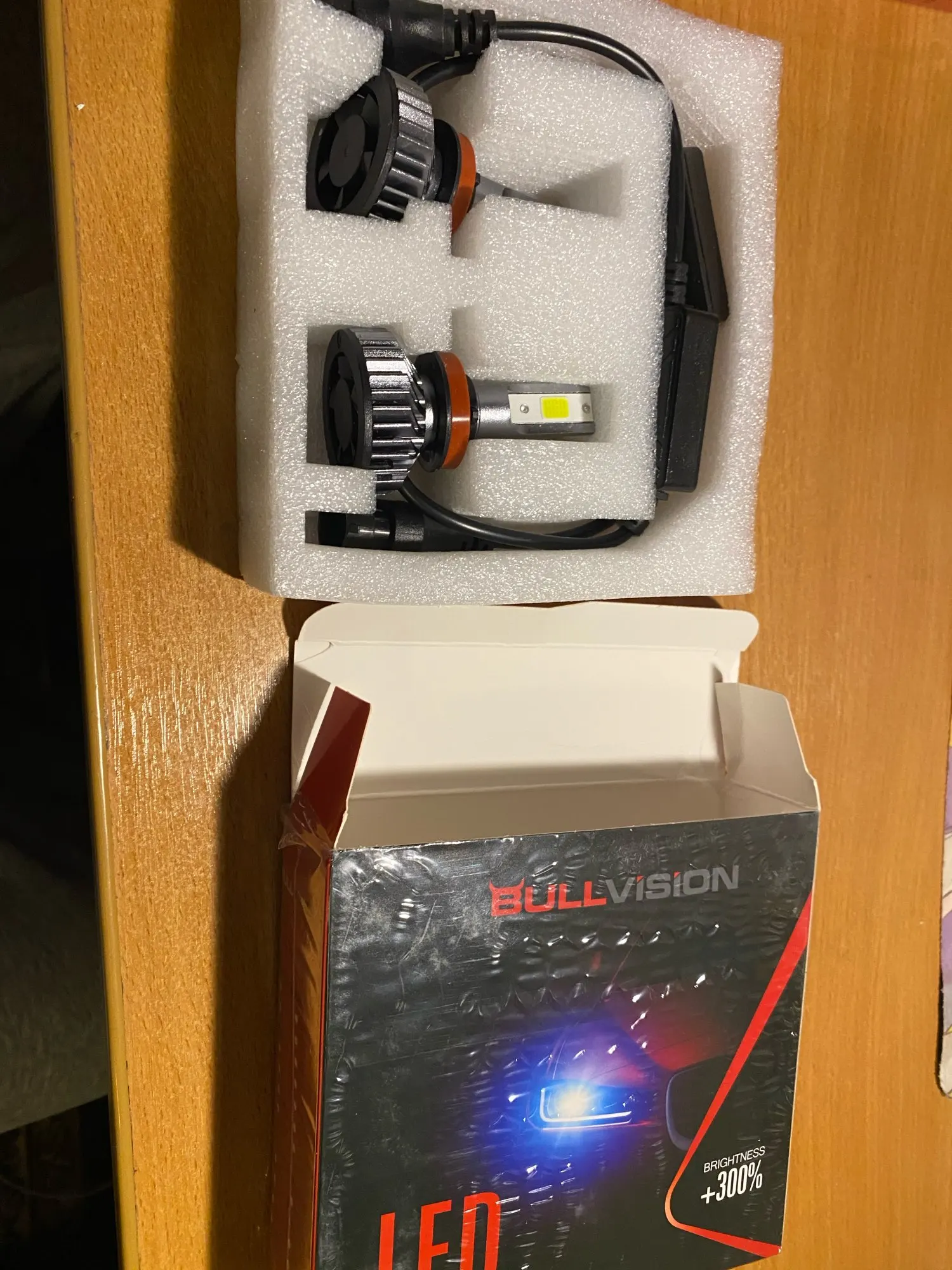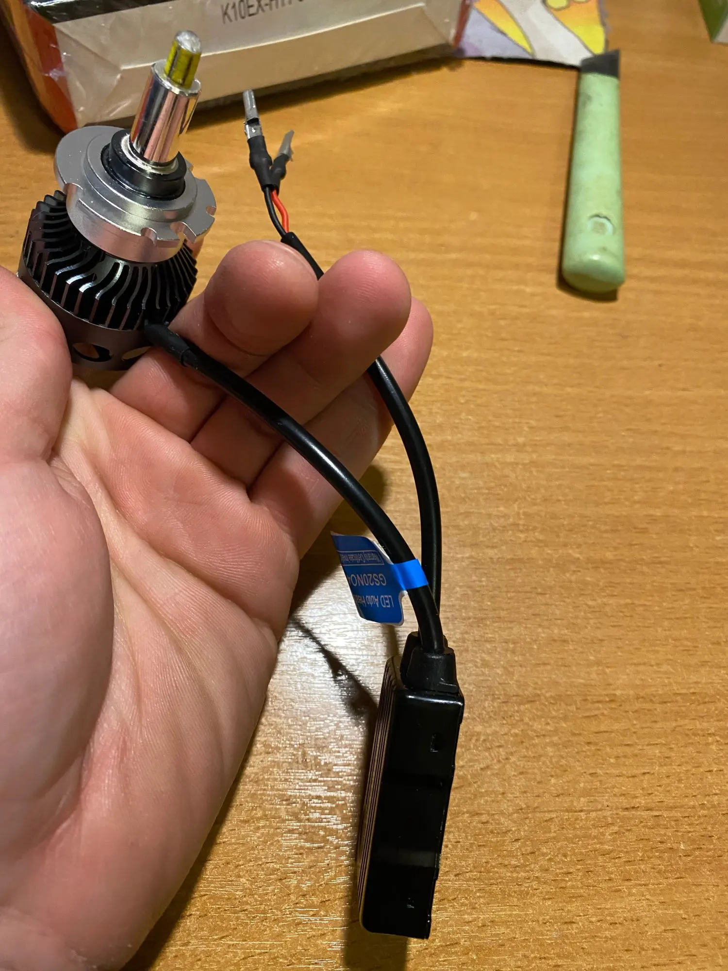 Хорошая брендированная коробка с характеристиками. Металл очень солидный по ощущениям. Нагреваются на удивление незначительно на открытом воздухе, посмотрим как будет в фаре. Выносные блоки греются, но на воздухе тоже ничего критичного, надо смотреть в фаре. Ток потребления - 2.1-2.2 ампера при 14.5 вольт, светят вроде ярко, но пока не поставил трудно сказать. Явно ярче других светодиодных ламп, в т.ч. брал подобной конструкции на 16 тыс.люмен