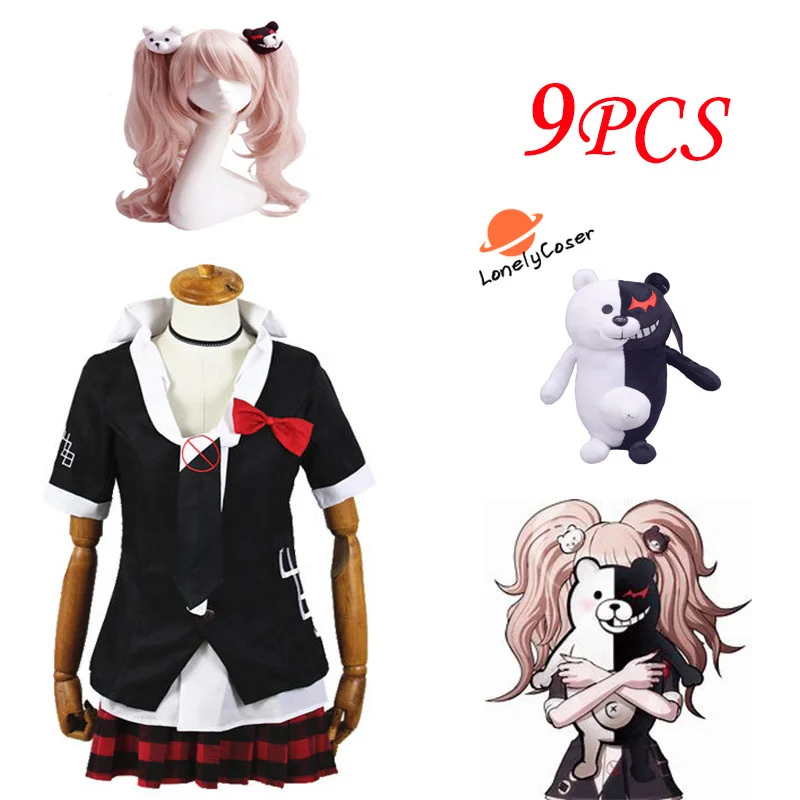Джунко эношима костюмы для косплея аниме данганронпа, с юбкой-рубашкой, игрушечный розовый парик с клипсой, термостойкий заколки с медведем для Хэллоуина