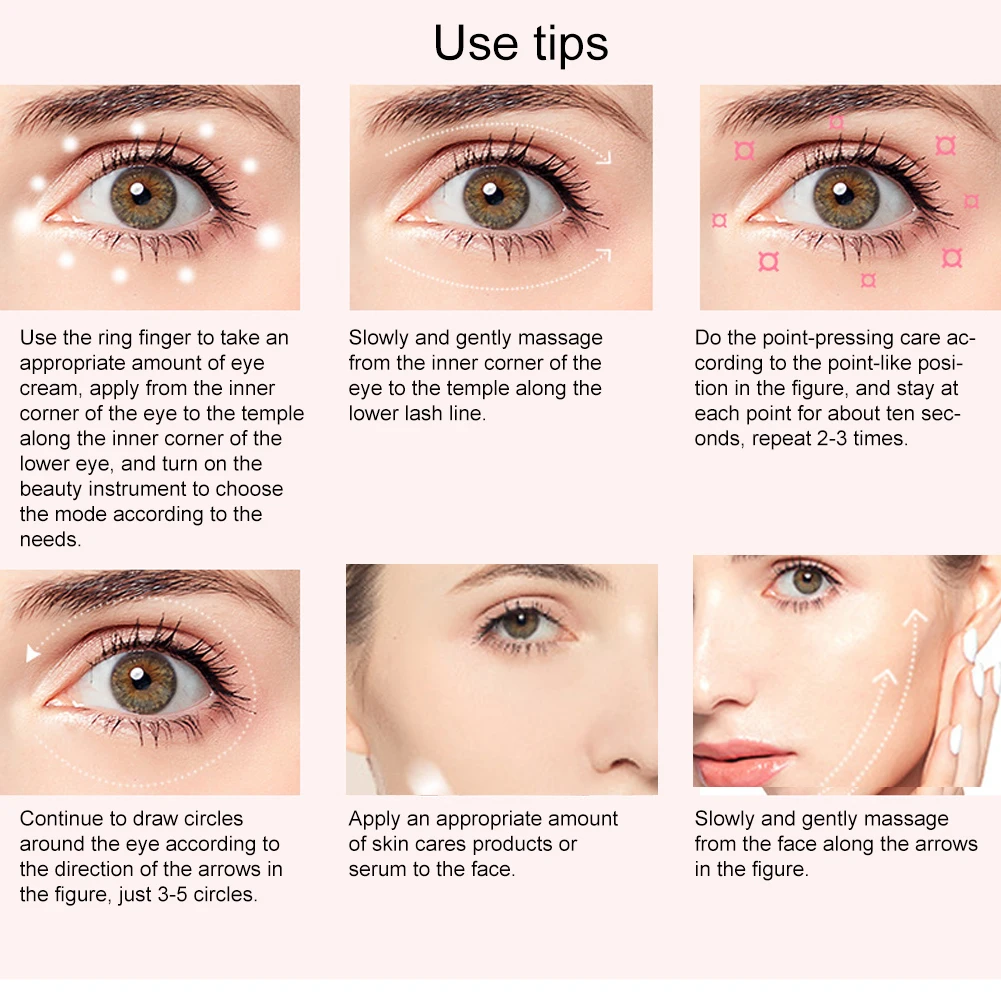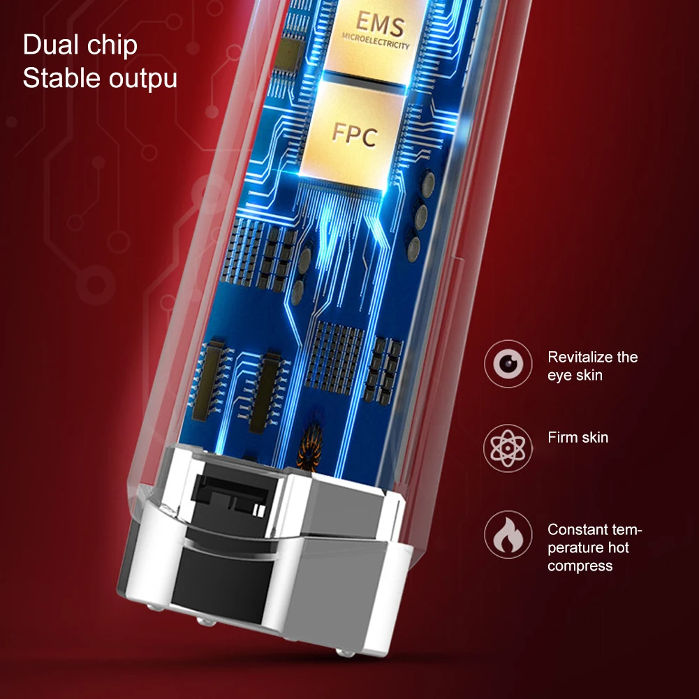 1. Стерео нагревательный сердечник с постоянной температурой, интеллектуальный контроль температуры, трехмерное отопление. 2. Горячая компрессионная терапия, Успокаивающая кожа глаз, улучшает темные круги и мешки под глазами. 3. EMS микро током, стимулирует мышцы и подтягивает кожу глаз, удаляет тонкие линии и краеугольные морщинки. 4. Двойная амплитуда частоты, подходит для различных типов кожи. 5. Синий светильник с низкой частотой вибрации, массажа и успокоения кожи. Красный светильник с высокой частотой вибрации + горячий компресс, лифтинг и подтягивание кожи, уход за кожей глаз. 6. Аккумулятор большой емкости 600 мАч, быстрая зарядка и долговечность, практичный и удобный.