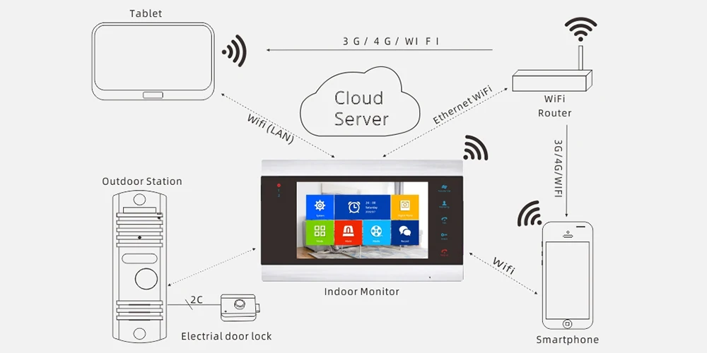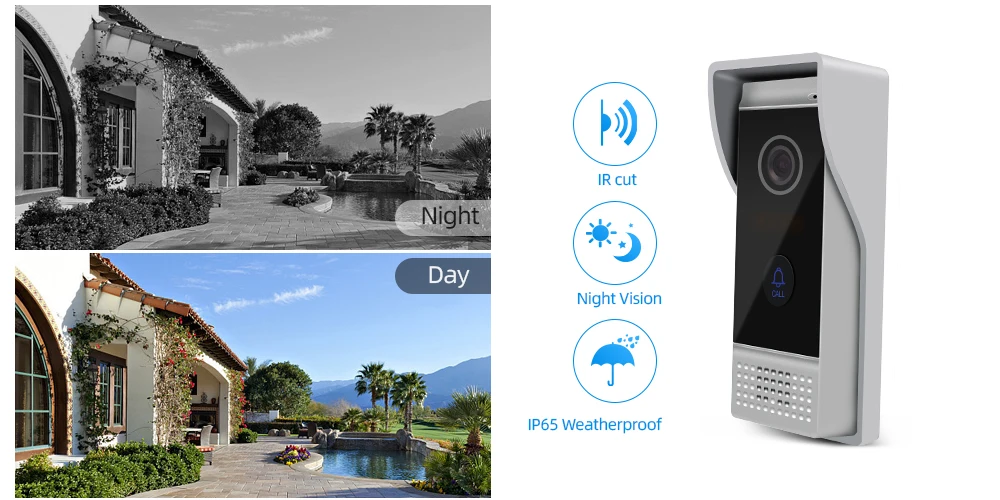 Это система видеодомофона с функцией Wi-Fi, которая поддерживает работу с мобильными телефонами, когда Посетитель нажимает дверной звонок, ваш телефон получит уведомление приложения, это означает, что вы можете использовать приложение для разблокировки двери, разговаривайте с посетителями, смотрите видео и так далее, когда Посетитель нажимает дверной Звонок