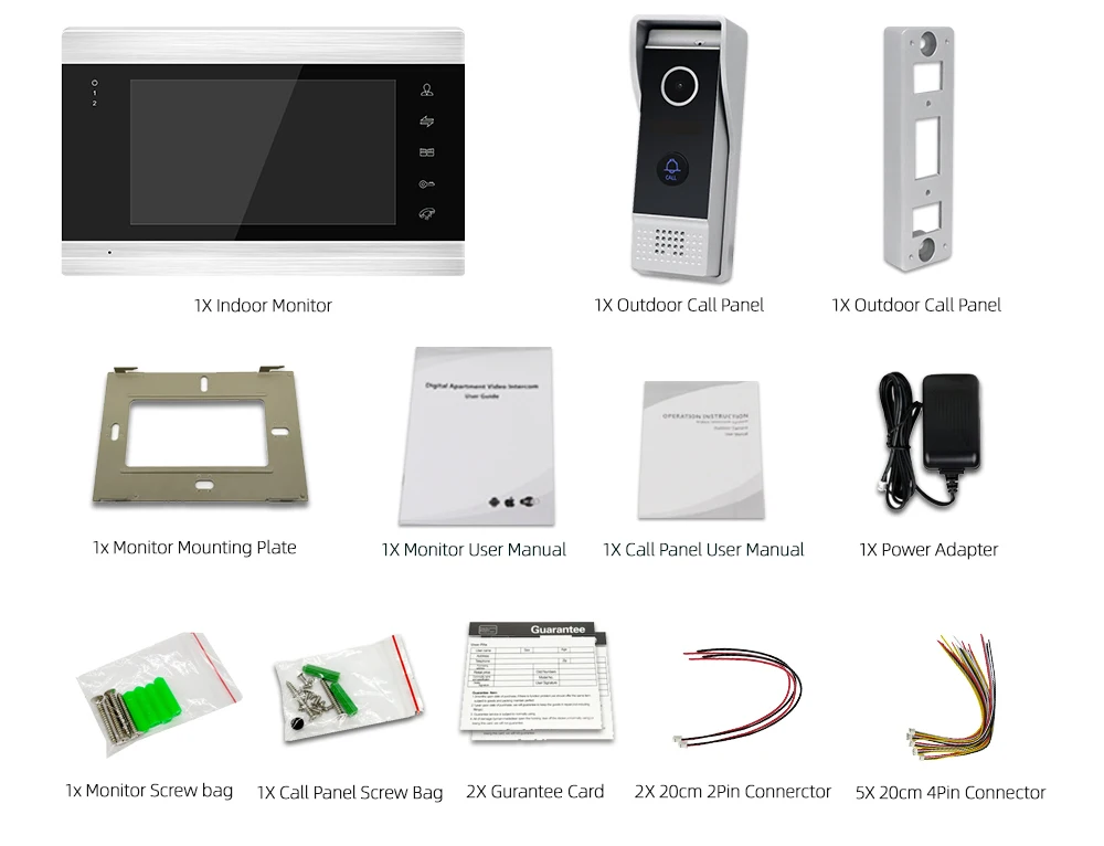 1 внутренний монитор1 дверной Звонок1x адаптер питания5x200 мм 4-контактный разъем2х гарантийная карта2x руководство пользователя на английском языке1 наружная панель вызова1x200 мм 2-контактный разъем, производство Китай2x винтовая сумка2x квалифицированный сертификат