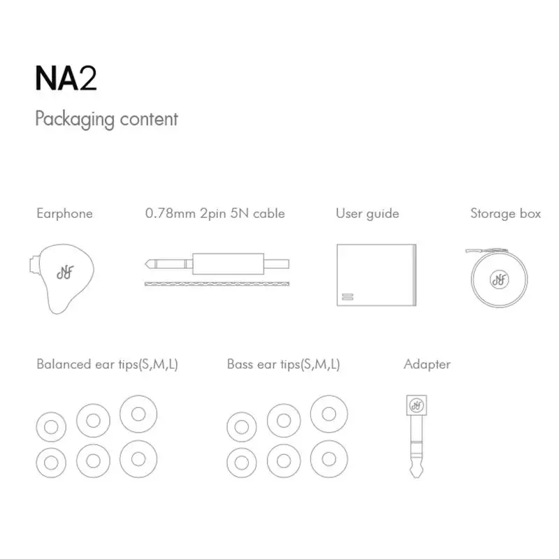 Параметры: Модель: NA2 Размеры: 138*225*50 Netwt:300 г драйвер: Динамический кабель динамического драйвера с двумя полостями: 0,78 мм 2-контактный Посеребренный разъем OFC: 3,5 мм Диапазон отклика частоты: 10-40 кГц максимальный SPL:125 дБ чувствительность: 108 дБ/мВт Искажение:<1% сопротивление: 18 Ом Звукоизоляция: 25 дБ Упаковка: наушники * 1 0,78 мм 2-контактный кабель 5N * 1 Руководство пользователя * 1 коробка для хранения * 1 сбалансированные насадки для ушей (S.M.L) басовые насадки (S.M.L) адаптер от 6,35 до 3,5*1