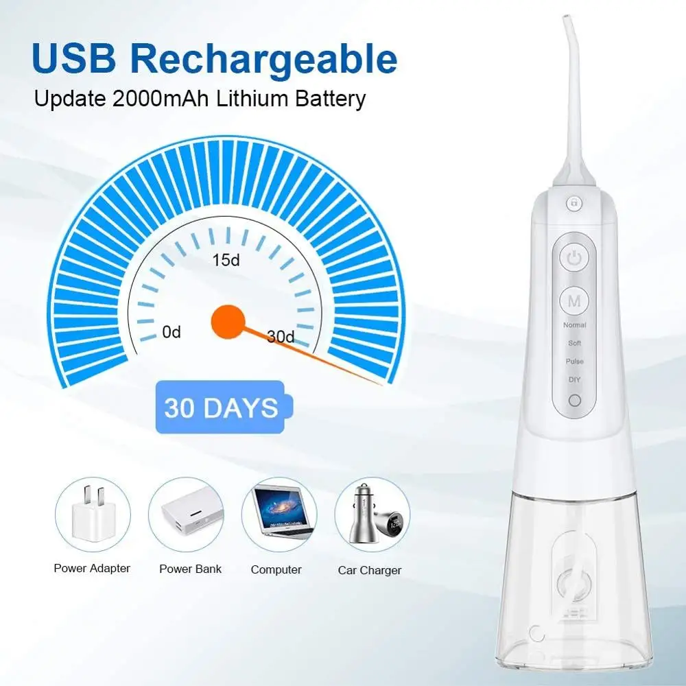 Класс водонепроницаемости: IPX7Комплектация:1 * ручка ирригатора полости рта3 * классическое сопло1 * скребок для языка1 * USB-кабель для зарядки1 * Руководство пользователяСоветы:1. Если вы хотите использовать с водой, ополаскивателем для полости рта или антибактериальными ополаскивателями, Следуйте рекомендациям стоматолога или гигиениста.2. Не смотрите лицом к глазам при включении флоссера.