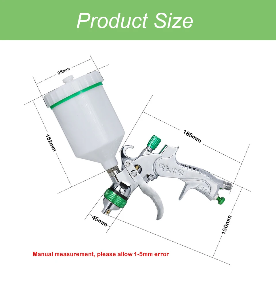 Характеристики: HVLP пистолет-распылительОсобенности 2: гравитационный пистолетФункция: КраскораспылительФункция 2: набор распылителя, аэрографТип: инструмент для ремонта, пистолет-распылительИнструменты: набор электроинструментов, пистолет-распылительРазмер насадки: 1,4/1,7/2,0 ммМатериал сопла: нержавеющая стальНоминальное давление: 45-60PSIПрименение: покраска забора, дверей, автомобилей и сгустков