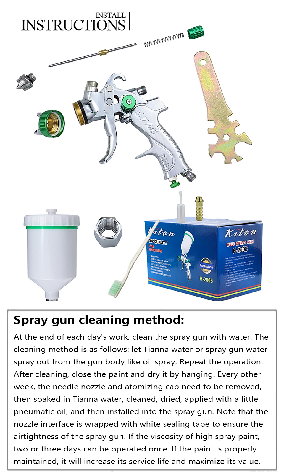 В конце каждого дня работы очистите распылитель водой. Метод очистки: дайте Tianna воду или водяной пистолет-распылитель распылить из тела пистолета, как масляный спрей. Повторите операцию. После очистки закройте краску и высушите ее, подвешивая. Каждую неделю необходимо удалить игольчатый сопло и распылительный колпачок, затем замочить в воде Tianna, очистить, высушить, нанести небольшим пневматическим маслом, а затем установить в распылитель. Обратите внимание, что интерфейс сопла завернут белой уплотнительной лентой для обеспечения герметичности распылителя. Если вязкость краски с высокой краской, два или три дня можно использовать один раз. Если краска будет правильно сохранена, она увеличит срок службы и максимизирует ее стоимость.