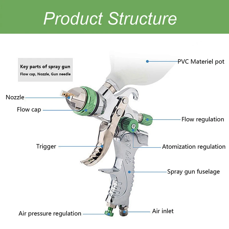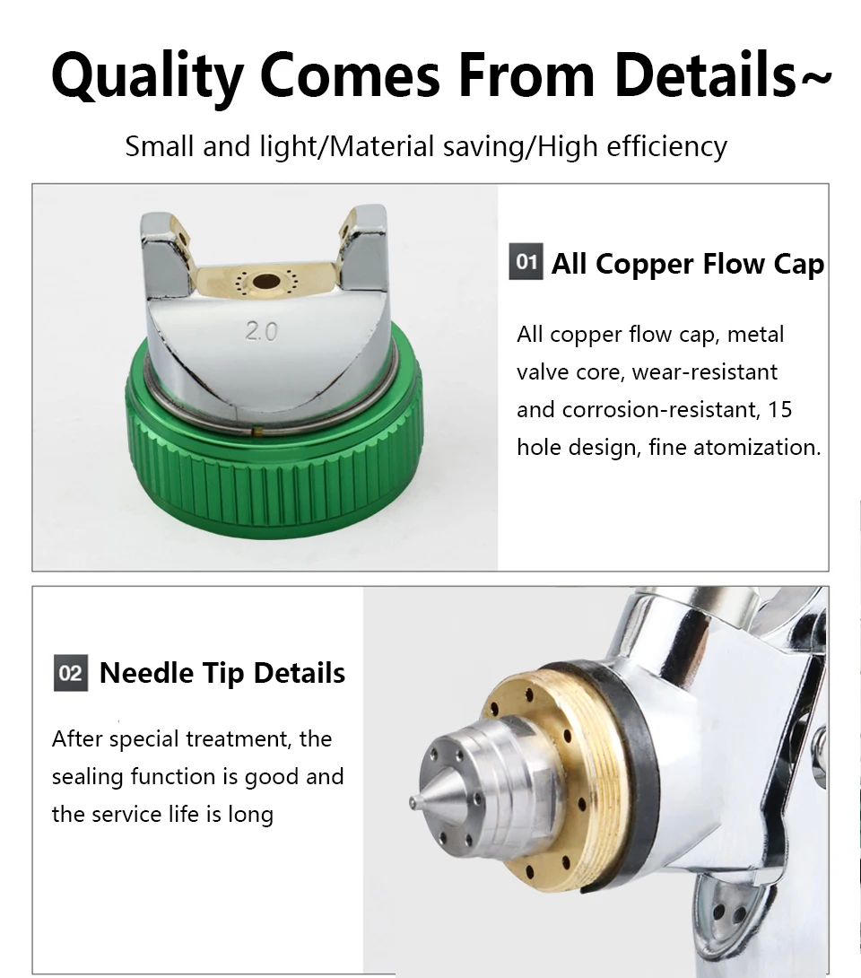 1. Пористый распылитель изготовлен из высокочистой латуни, чтобы сделать пористую высокоскоростную воздушную крышку, а распыление более деликатное, а поверхность вентилятора больше.2. Игольчатое сопло из нержавеющей стали, изготовленное из нержавеющей стали, после специальной термической обработки, прочное, долговечное и гладкое окрашивание.3. Высокоточная структура, изготовленная из высококачественного алюминия, уникальное мастерство, долговечность и недеформация, качество и стандартный вес сосуществуют.4. Клапан управления зубчатой передачей, уникальный клапан управления зубчатой передачей, светильник с плавным вращением, потоком, объемом воздуха, диапазоном распыления и т. д. может управляться по желанию во время эксплуатации, гуманизированной конструкции.