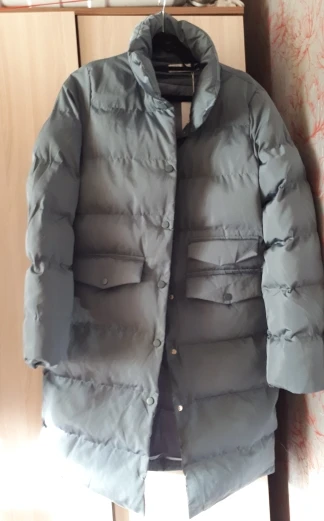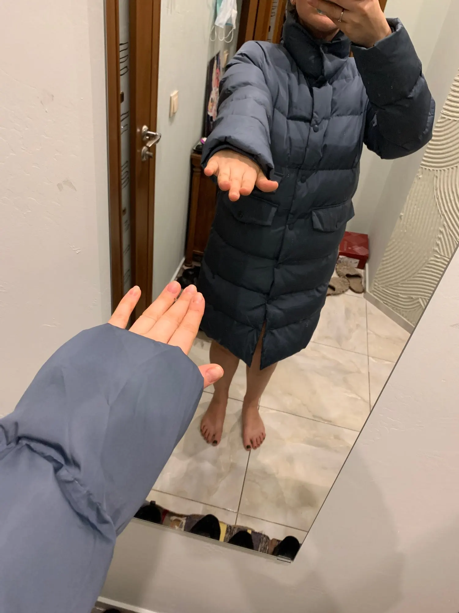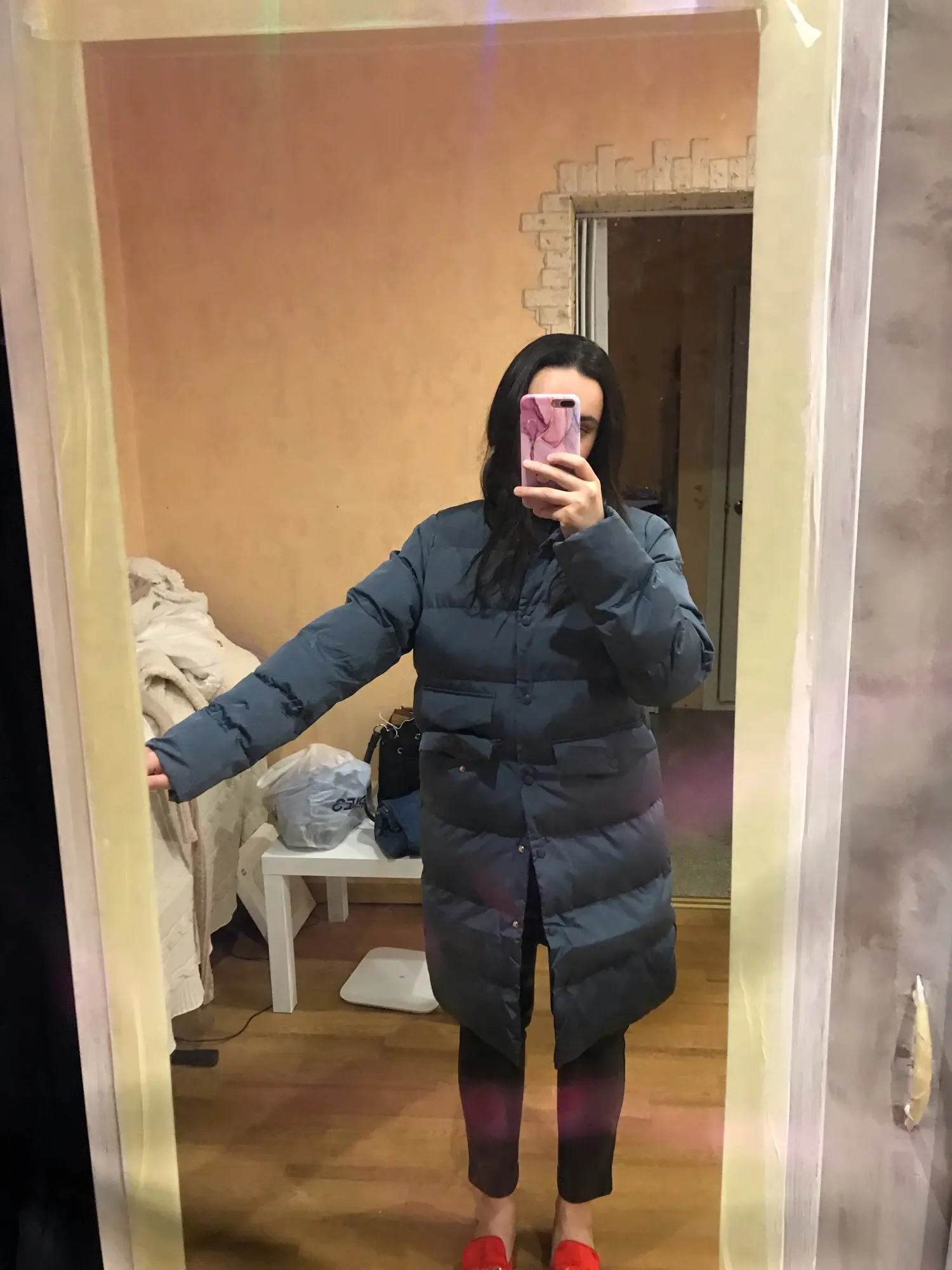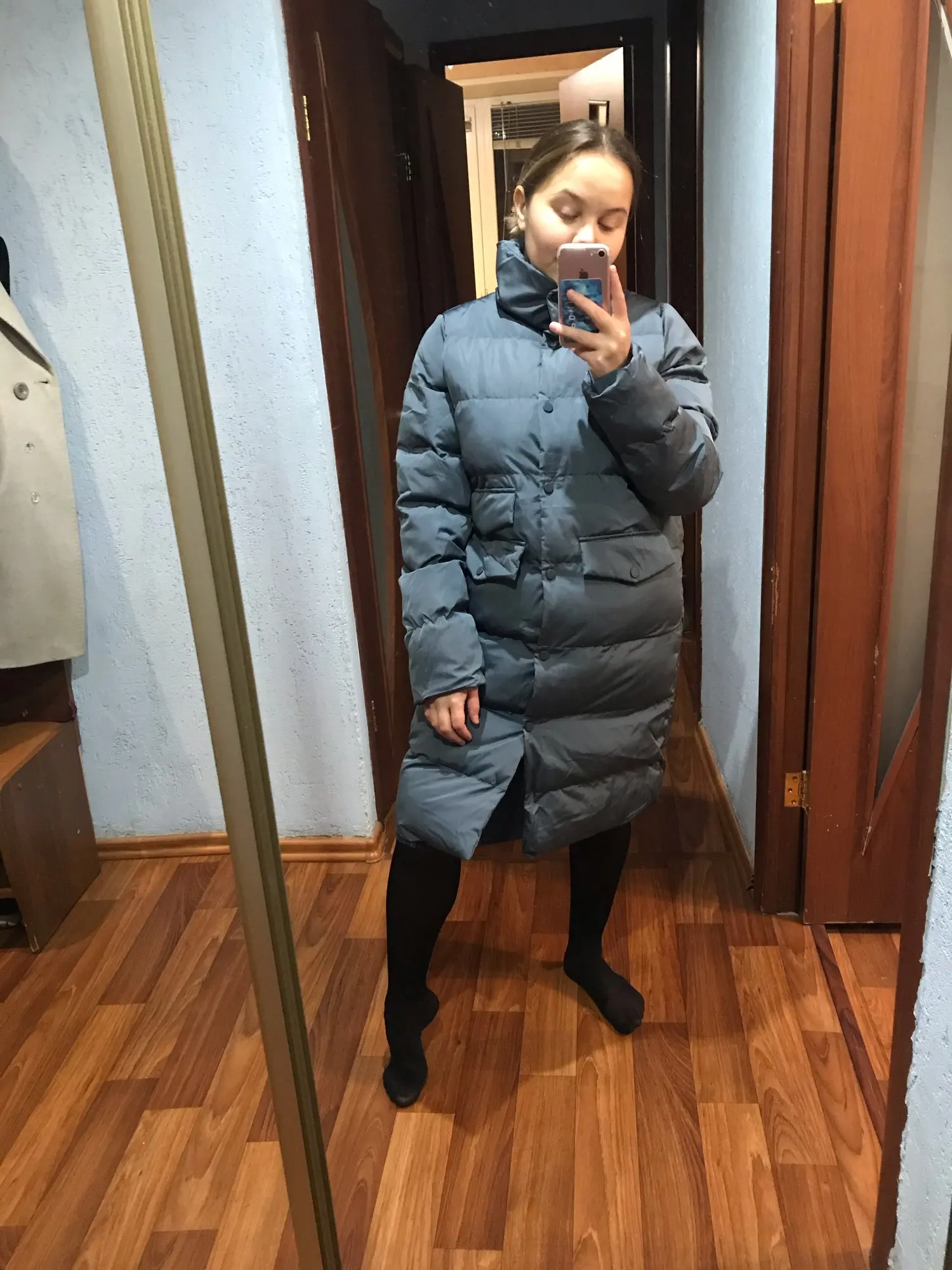 Это мой первый пуховик с Али, дошел за 10 дней до пункта выдачи в 5-ке. Цвет очень красивый, такой серо-синий что ли) Кнопки отлично работают, на свой размер 44 (95-72-96) заказала L, отлично сел, в меру свободно, плечи на месте, длина до колена при росте 170 см. Но по ощущениям на зиму тонковат, наверное до -15, проверим на практике, позже дополню фотками.