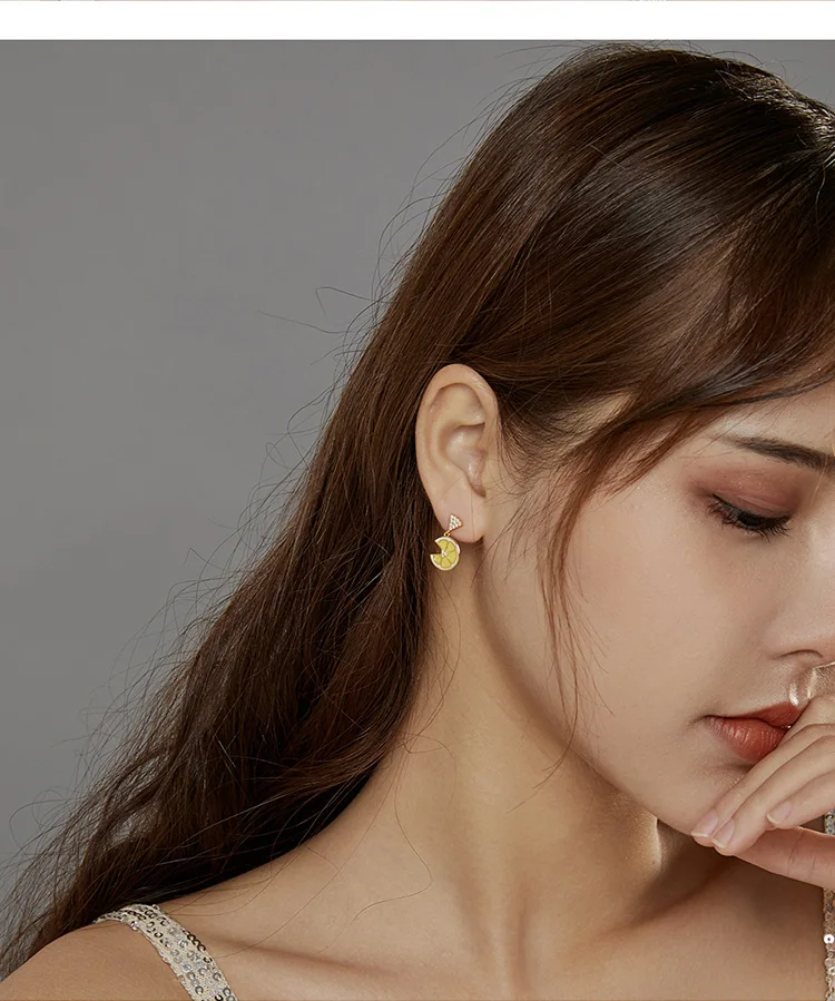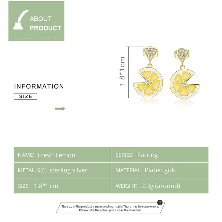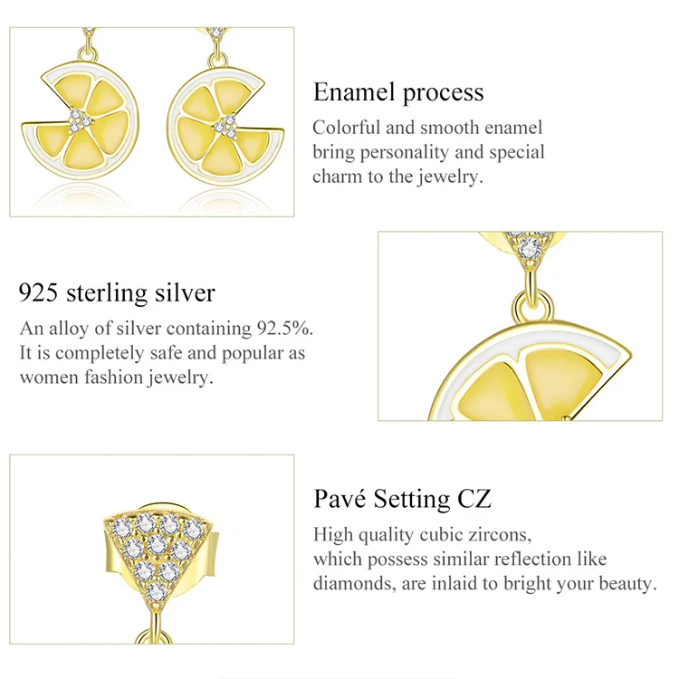 Материал: S925 + покрытие золотом + паве фианиты + процесс эмали Размер: 1,1*1,2 см Описание: Простая форма ломтика лимона придает свежий фруктовый аромат.