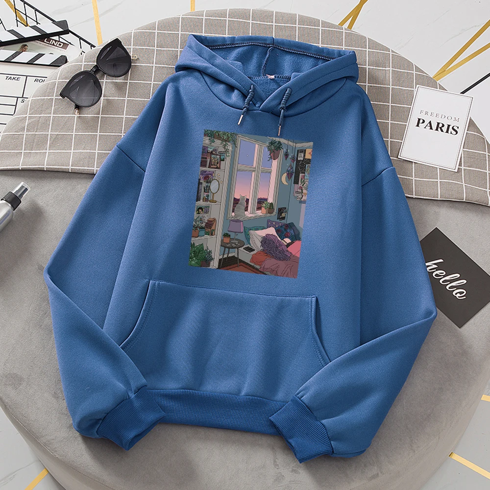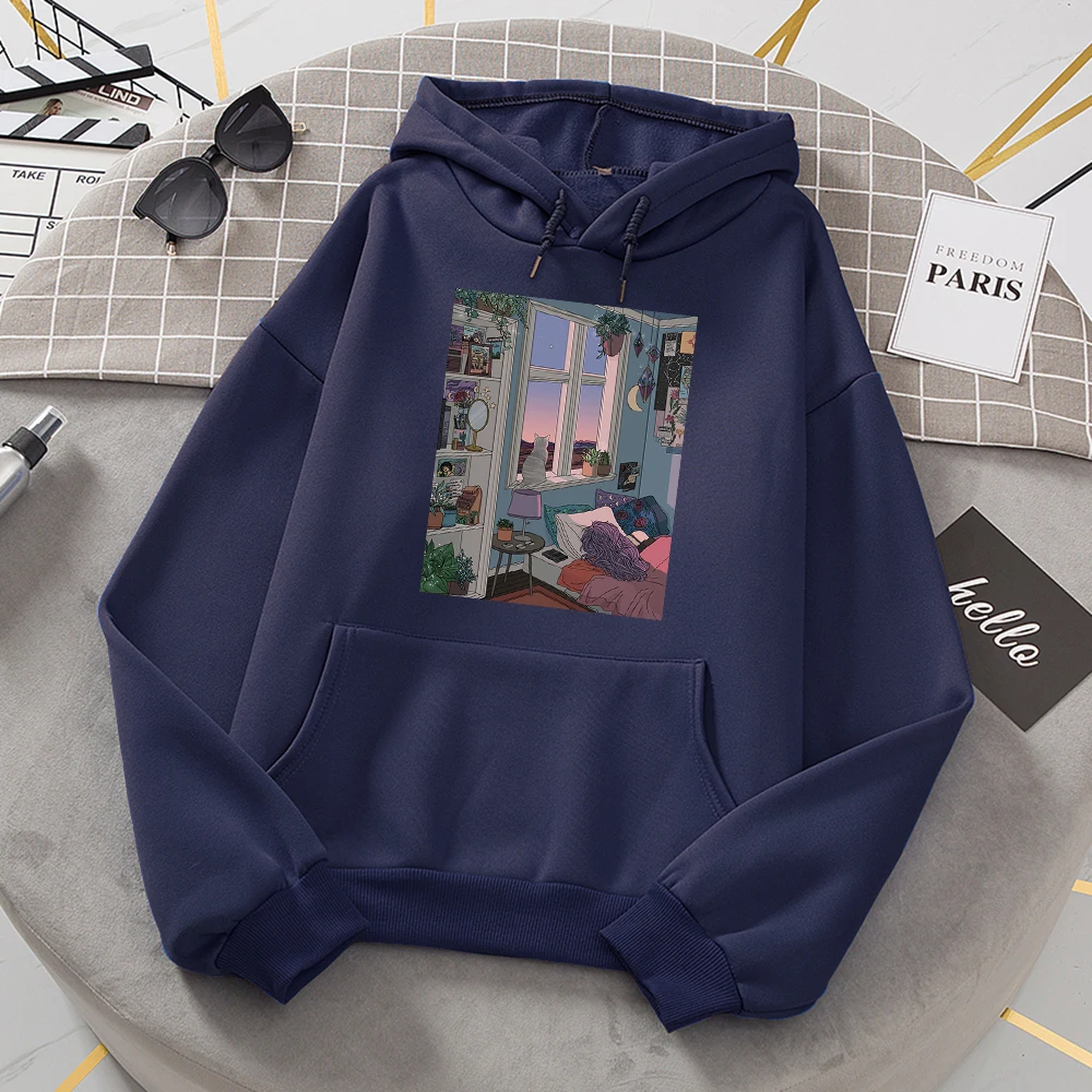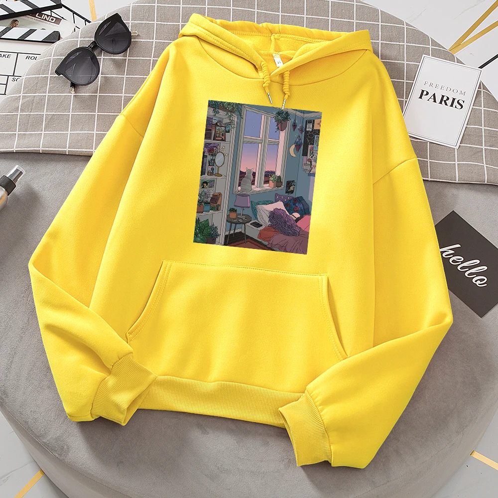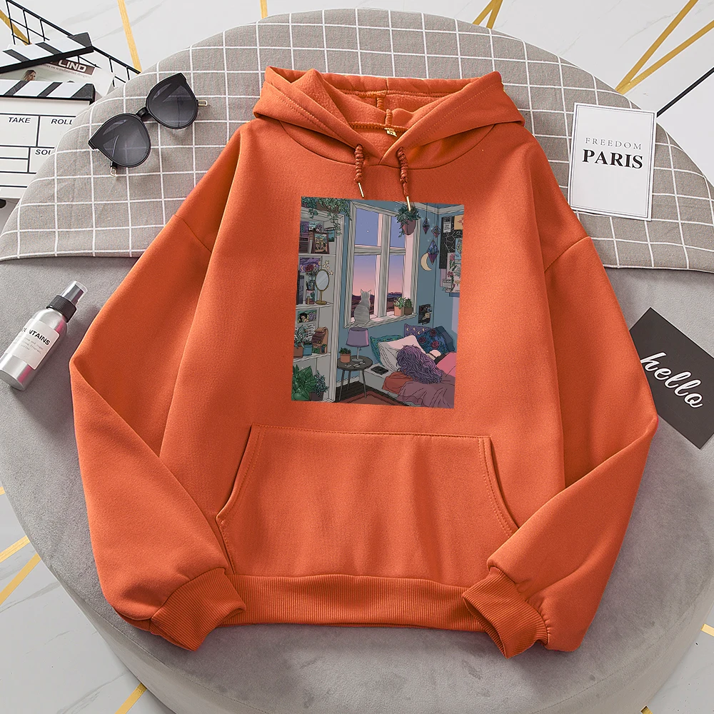 Худи с изображением ночного города и иллюстраций, женская модная свободная толстовка, модные худи с круглым вырезом, Повседневная Женская одежда из флиса