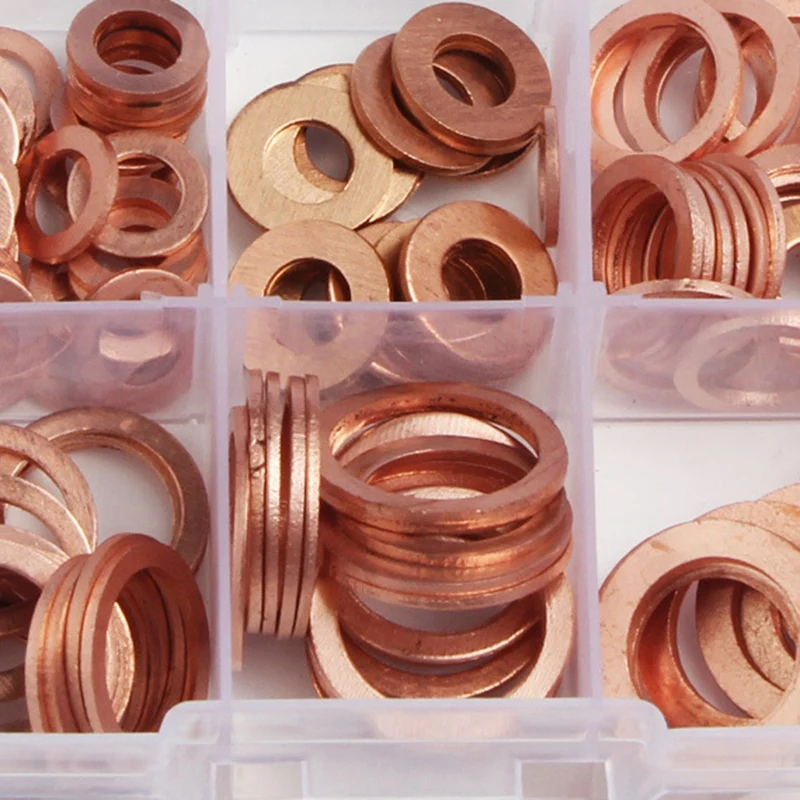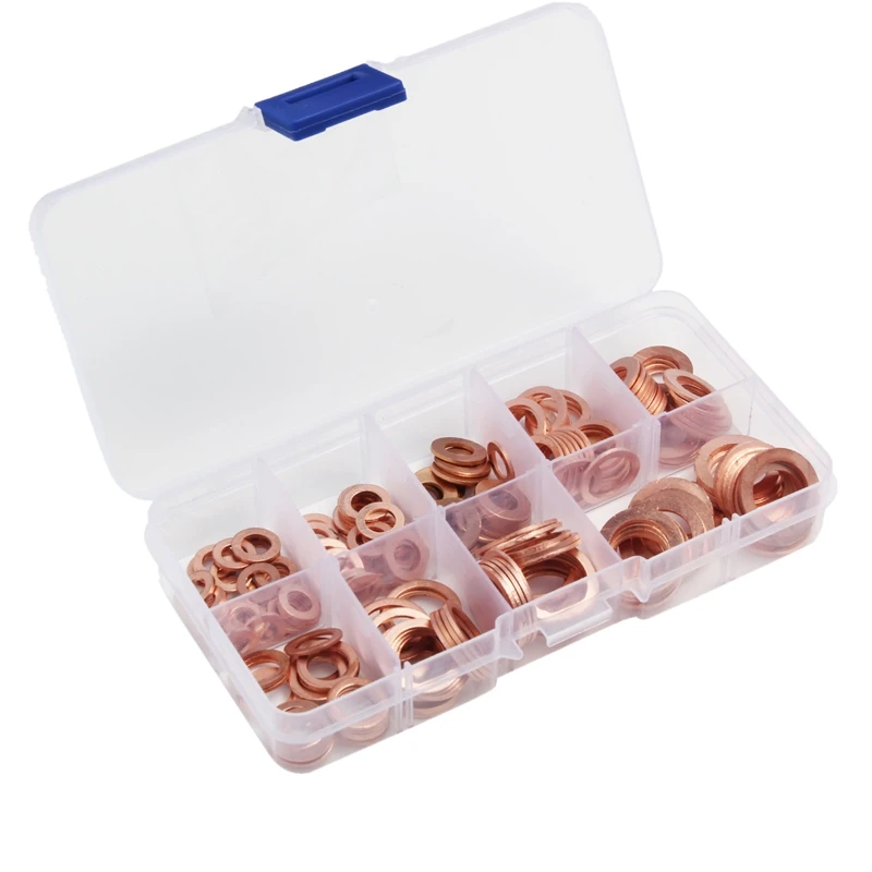 200 шт. 9 размеров медные шайбы Ассорти Твердые медные Прокладки Шайбы комплект уплотнительных колец Комплект оборудования M5/6/8/10/12/14 с пластиком Ca