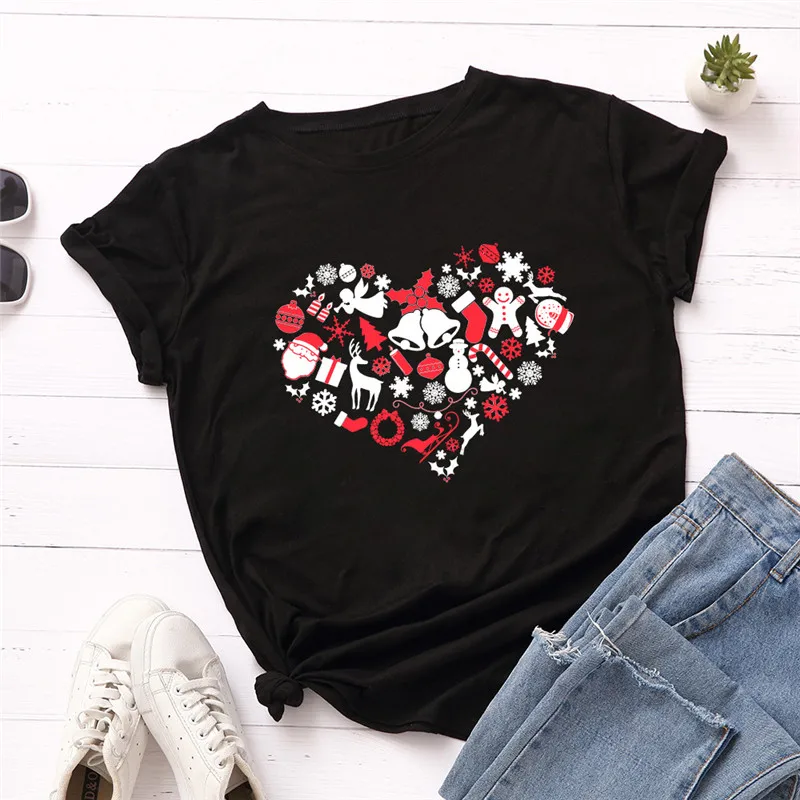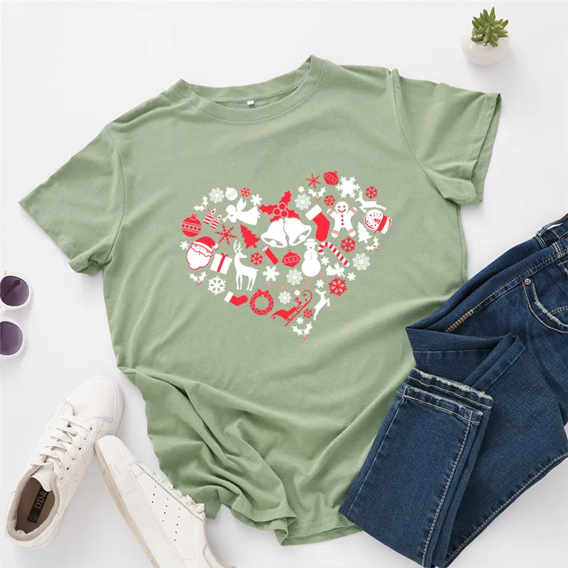 Женские футболки с рождественским принтом колокольчиков, футболка оверсайз с круглым вырезом и коротким рукавом, футболки с графическим принтом, топы из 100% хлопка