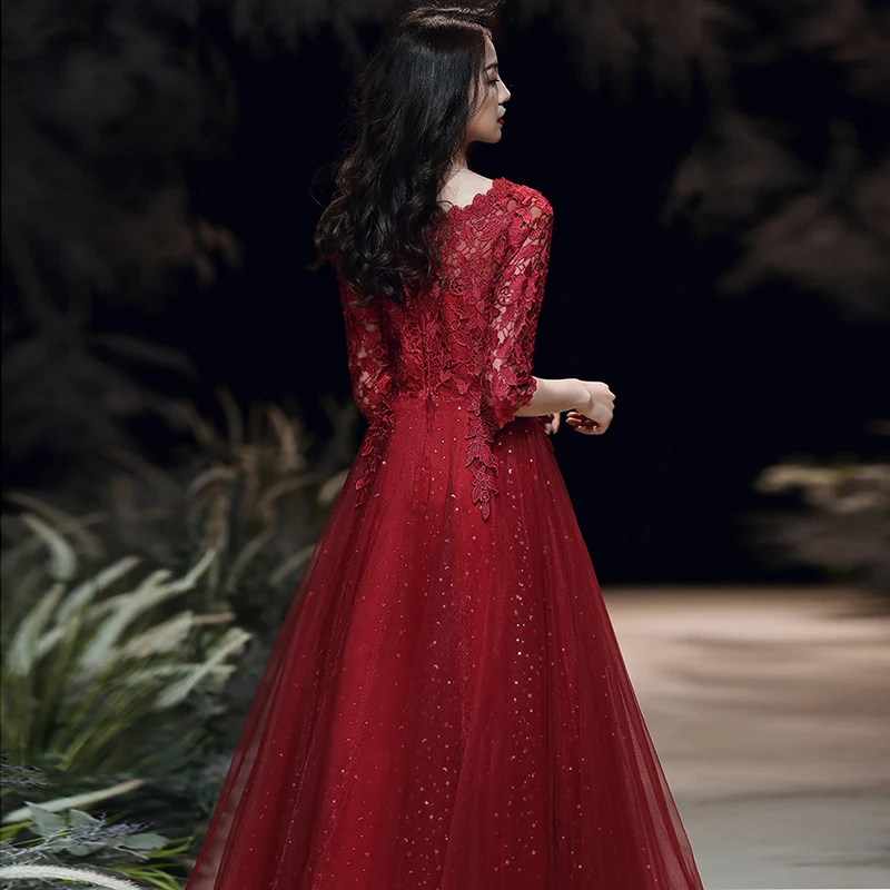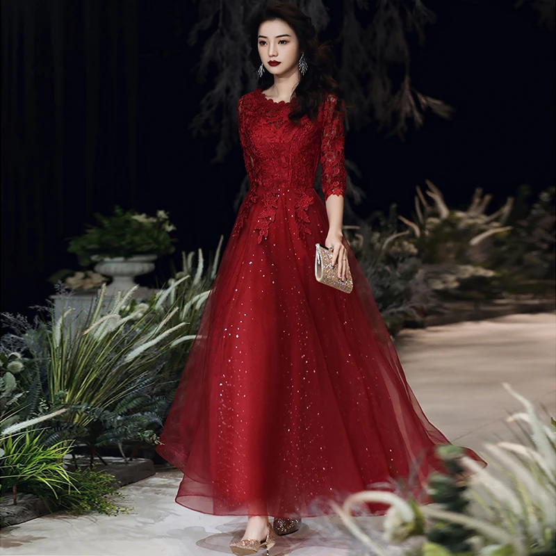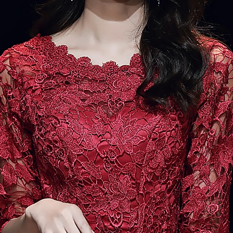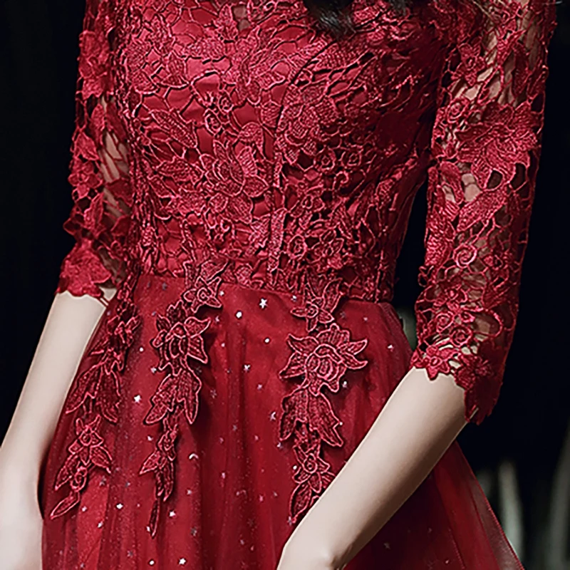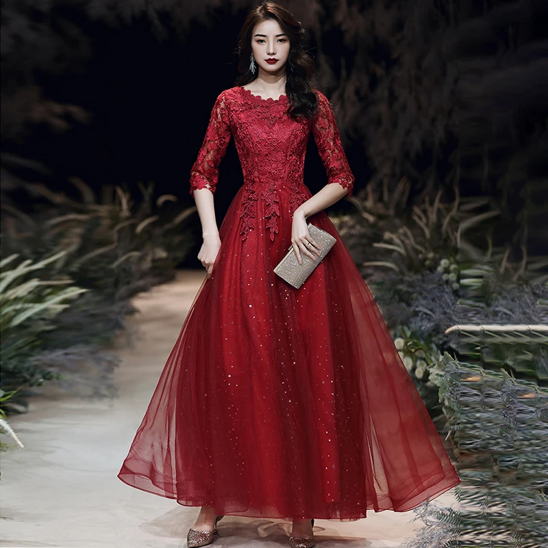 Кружевные вечерние платья, женское бордовое ТРАПЕЦИЕВИДНОЕ ПЛАТЬЕ до пола с круглым вырезом и рукавами до локтей, модель A093 по индивидуальному заказу, размера плюс