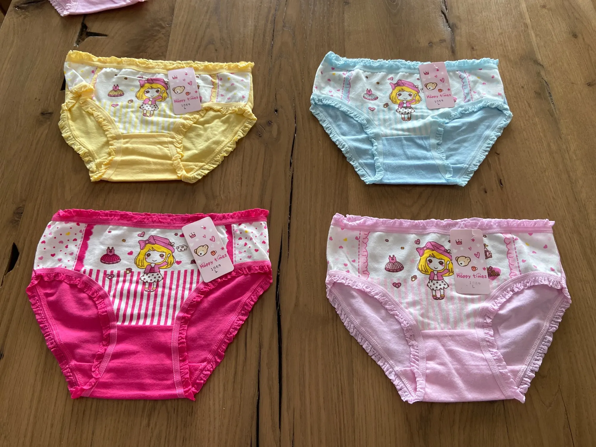 Трусики очень мягкие и приятные,цвета яркие.На стройную девочку 8.5 лет размер 8-10 лет сидит чуть свободно.Доставка быстрая,меньше месяца.