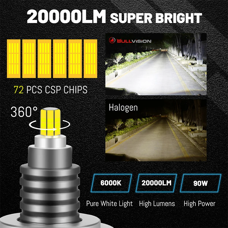 Светодиодный ные фары H7 20000LM 4300K 6000K 8000K H4 9012 HIR2 H1 H11 H8 H9 9005 9006 HB3 HB4 360 градусов CSP, дальний и ближний свет