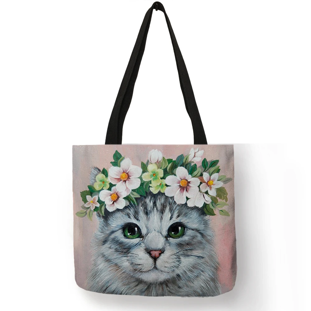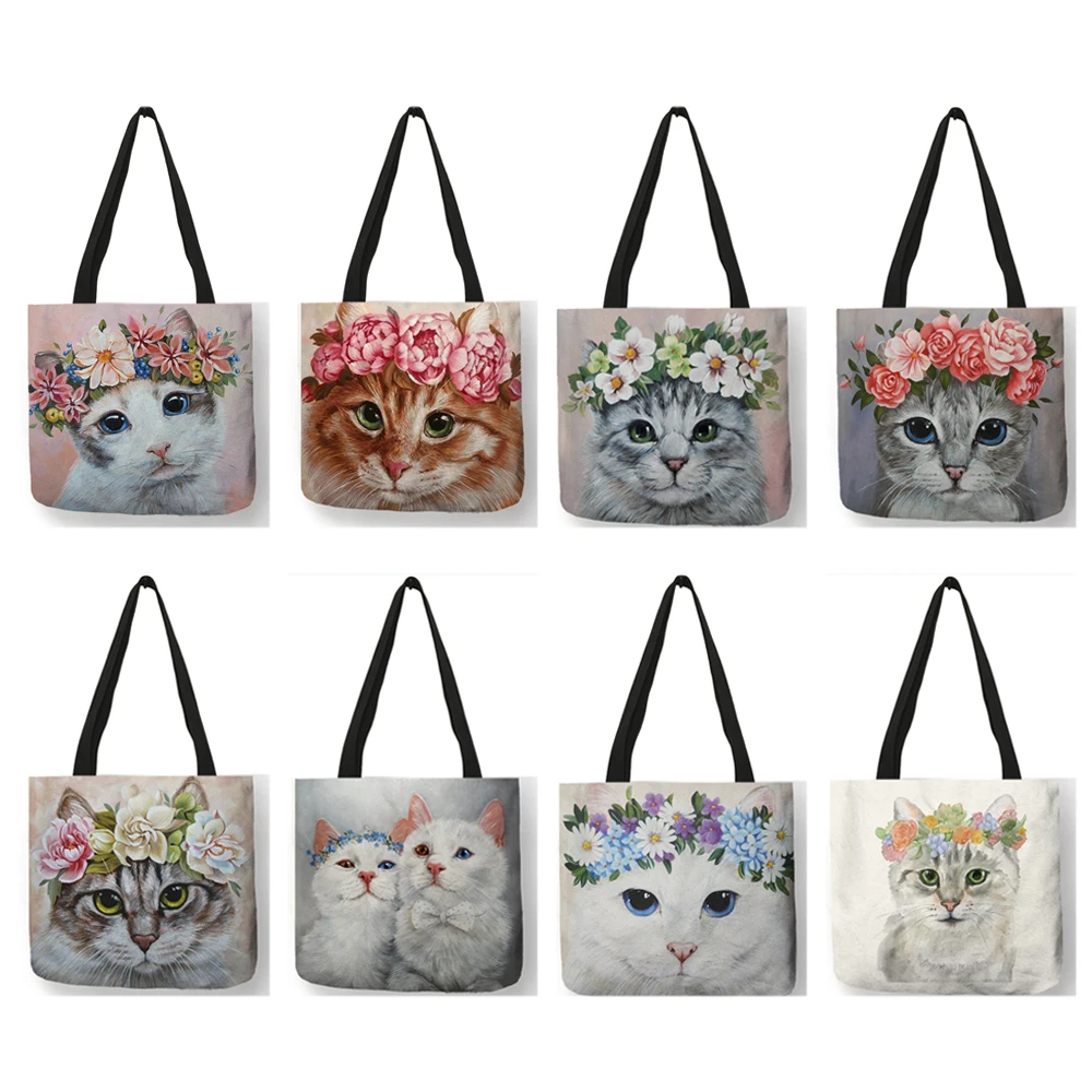 Новое поступление, женские модные сумки с цветочным принтом кота, сумки, повседневные школьные сумки на плечо, многоразовая сумка для покупок с короткими ручками B01079
