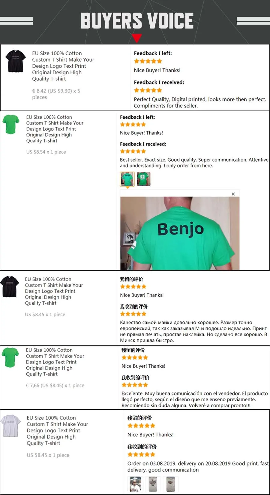Отлично, как обычно. Это повторный заказ, и принт действительно хороший. Настоятельно рекомендуется. Также очень легко общаться с продавцом по поводу дизайна. Товары были отправлены быстро, и я получил без проблем.