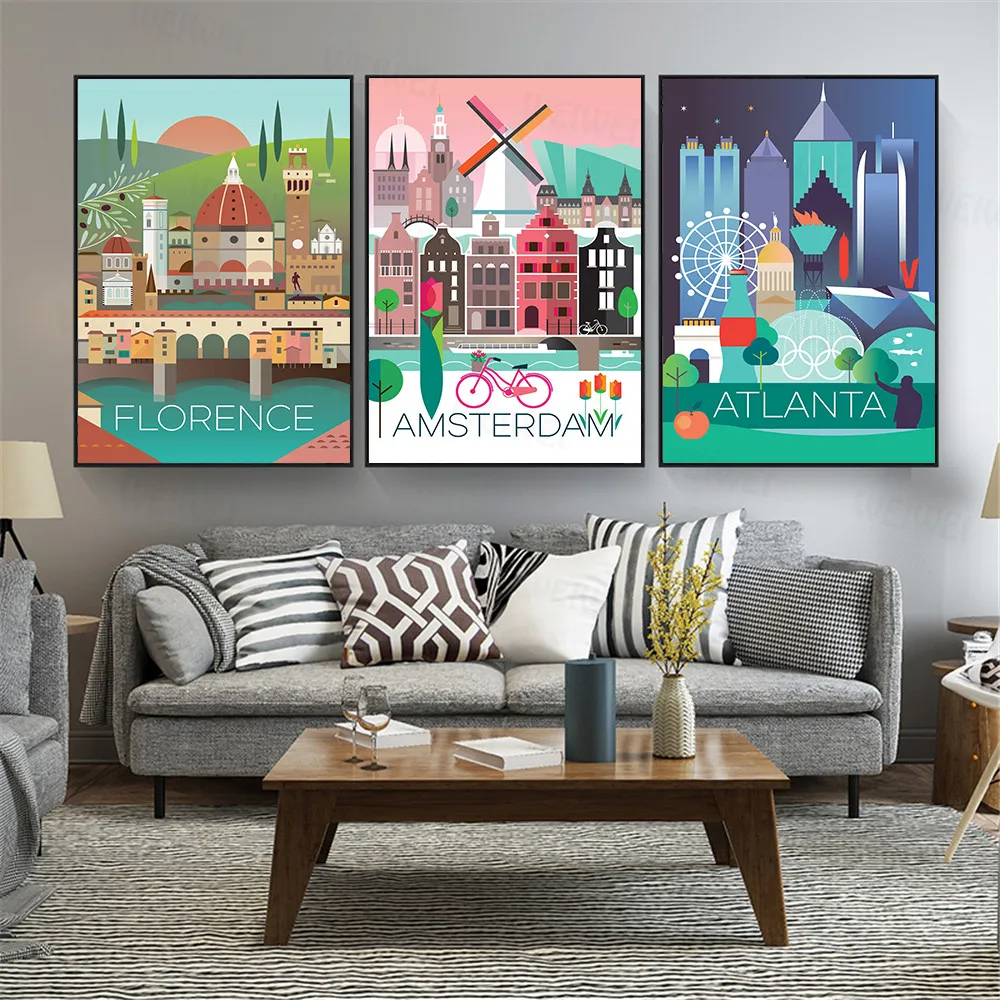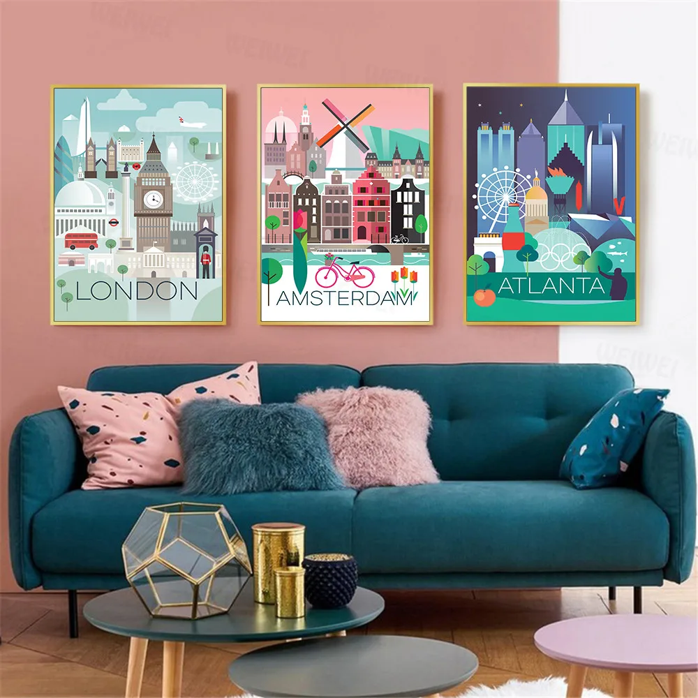Картина на холсте, Париж, Лондон, Атланта, Флоренция, мультфильм, архитектура, Настенная картина для гостиной, домашний декор