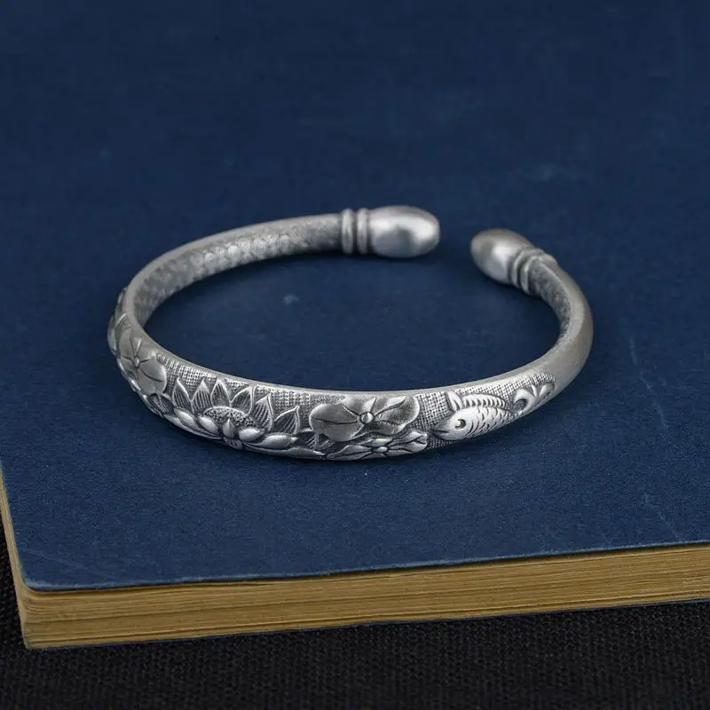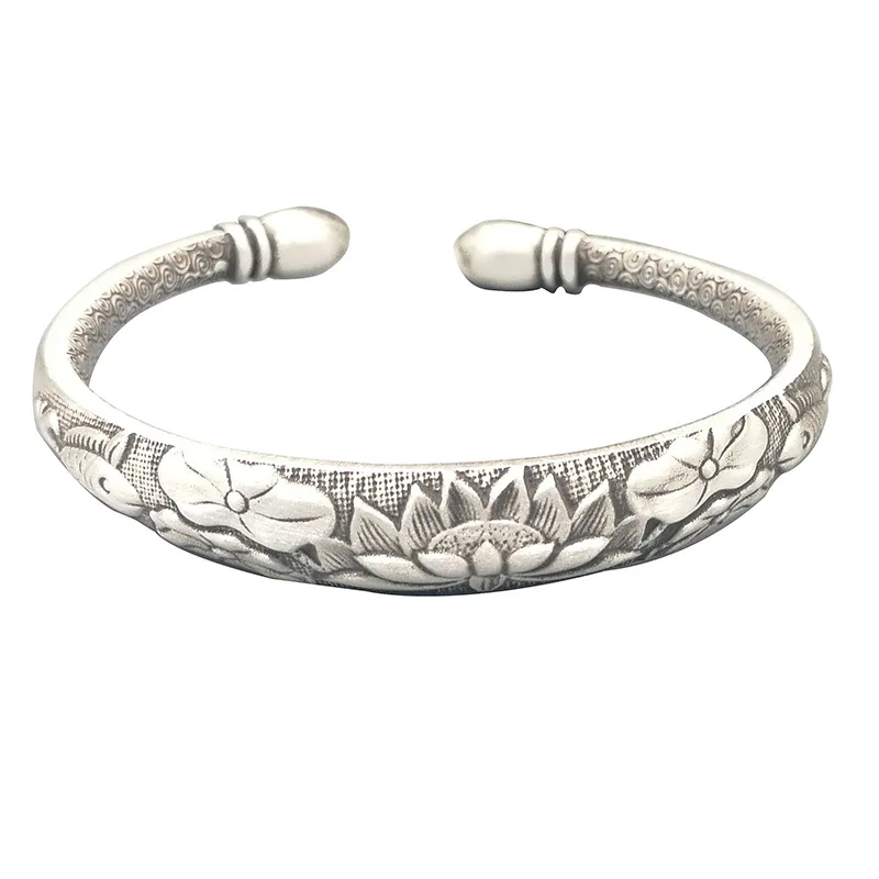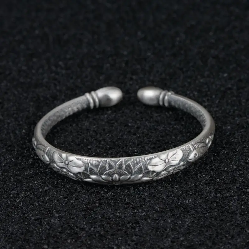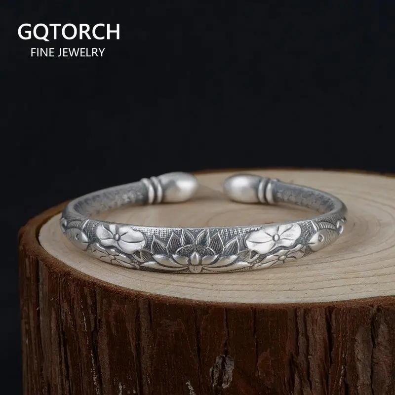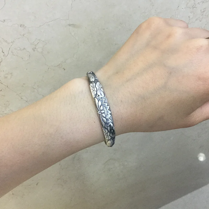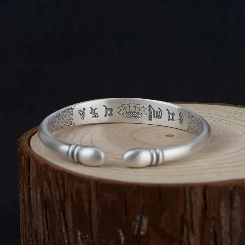 Тибетские винтажные серебряные браслеты с мантрой с шестью словами для женщин открывающиеся буддийские ювелирные изделия из чистого серебра S990 ретро браслет.