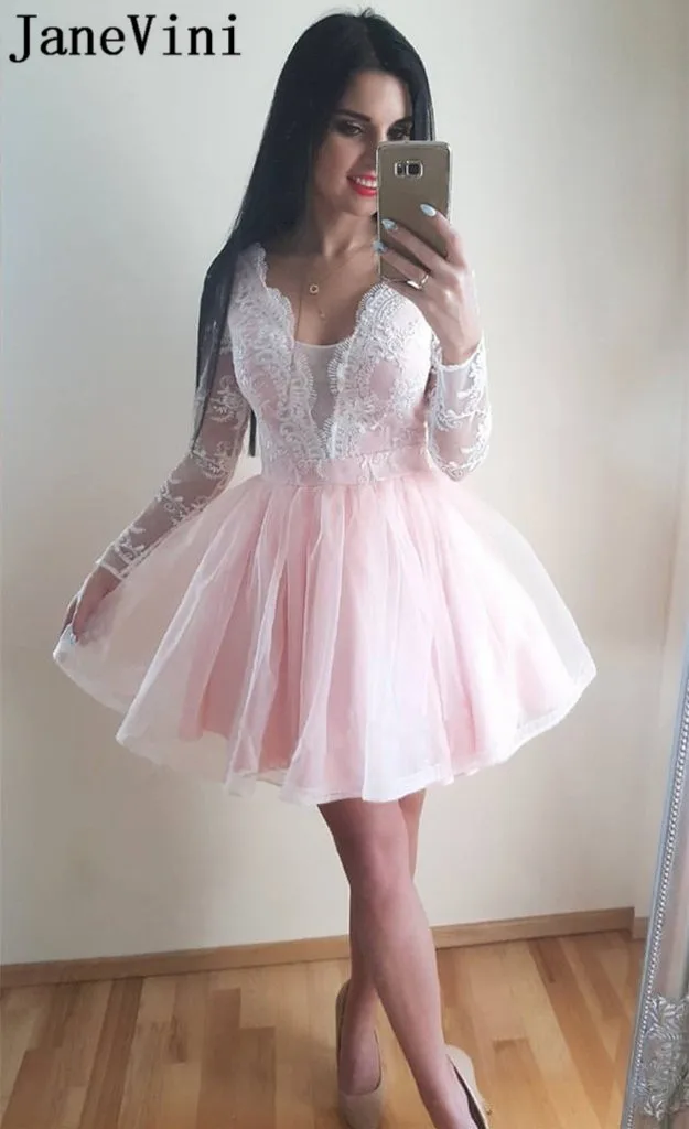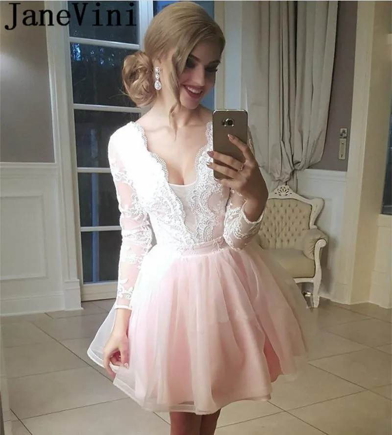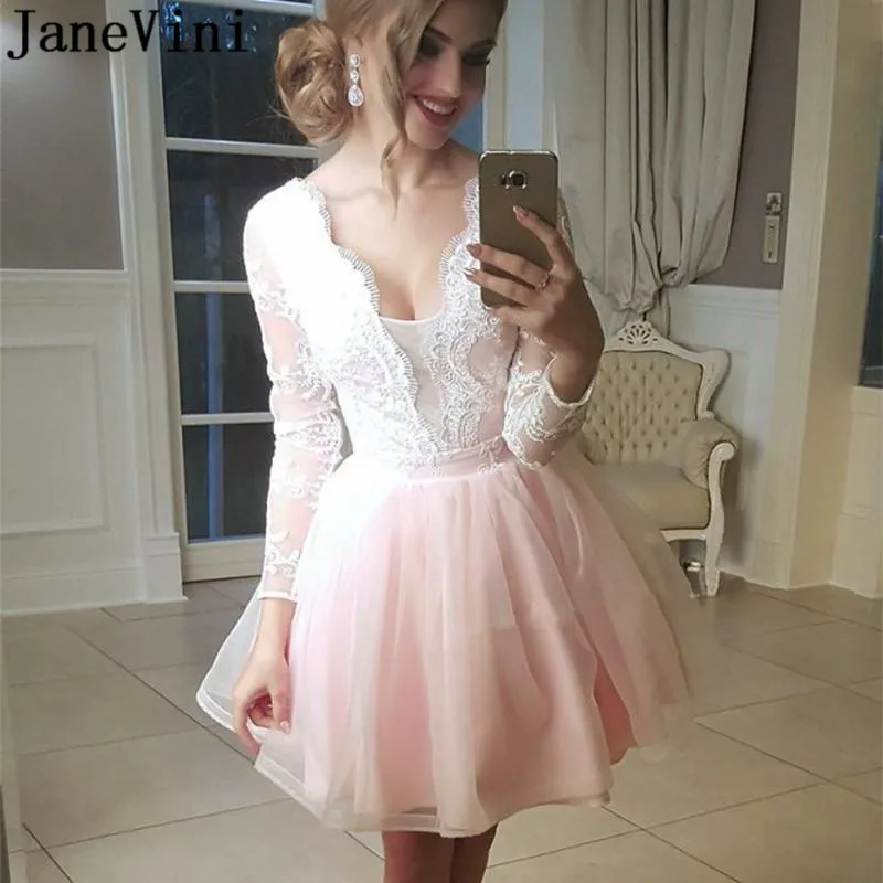 JaneVini элегантные коктейльные платья с длинным рукавом 2020 короткие платья с v-образным вырезом и кружевной аппликацией из тюля для торжественных случаев размера плюс