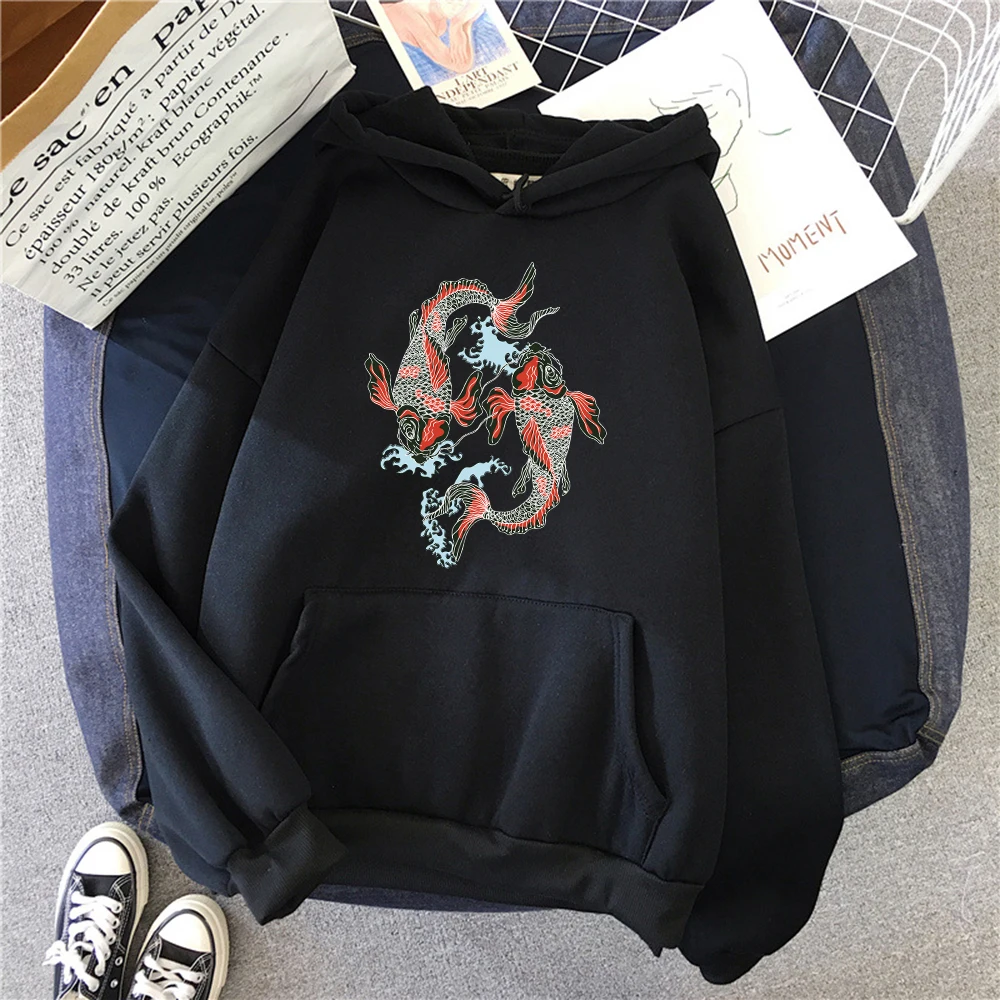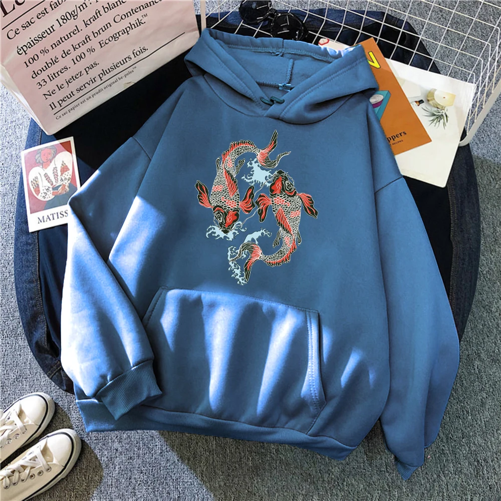 Пуловер двойной кои японский принт, Теплая мужская толстовка с капюшоном, уличная Мужская толстовка, повседневные мужские пуловеры известного бренда